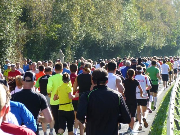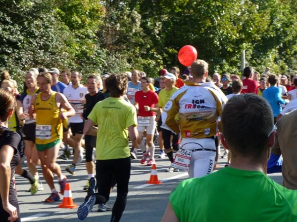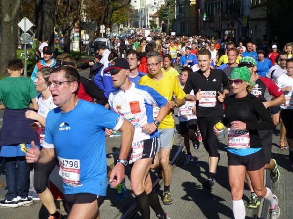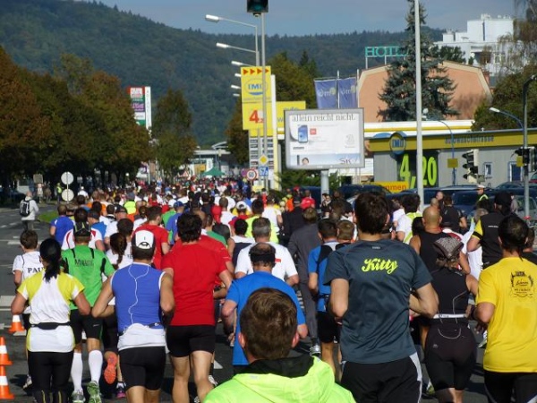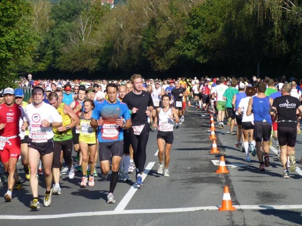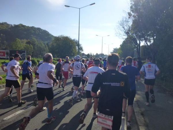 Ein wahrer Menschenauflauf mit entsprechender Stimmung erwartet uns, schon wieder ganz nahe am Schlossberg, bei km 12. Nur eine schmale Passage wird den Durchlaufenden gelassen. Des Rätsels Lösung: Die erste Staffelübergabe der Staffelmarathonläufer steht an. Und da sich in diesem Jahr weit über 200 Staffeln mit je 4 Läufern angemeldet haben, ist der Druck groß, möglichst nahe an der Strecke zu stehen, um den Laufpartner frühzeitig im Gewühl auszumachen.