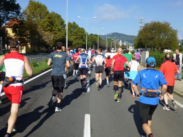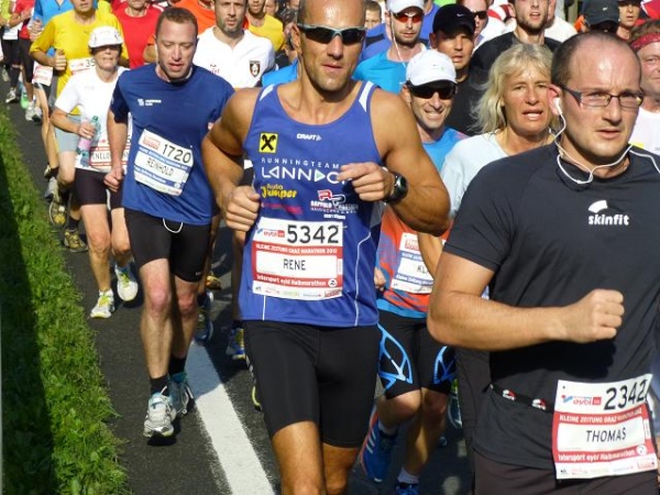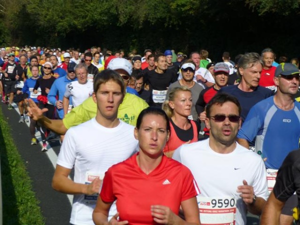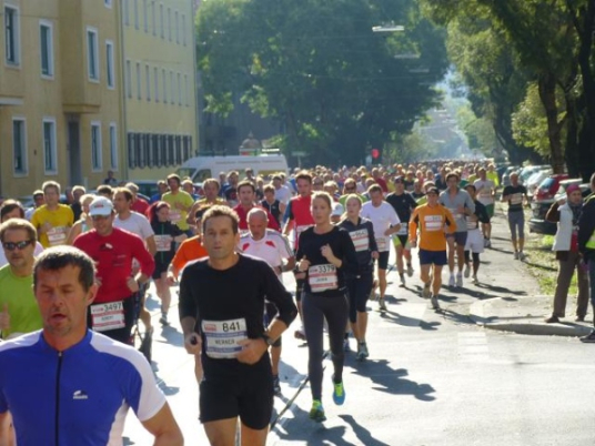 Theodor-Körner-Straße - Grabenstraße - Weinzöttlstraße heißt die Achse, auf der wir uns fortbewegen. Über die Attraktivität gerade dieses Streckenstücks hatten sich schon im Vorfeld einige Läufer im Forum der Marathonhomepage mockiert. Und zugegebermaßen ist der Weg durch locker bebautes Gewerbegebiet mit ab und zu Alleegrün nicht unbedingt die Art von Highlight, die man sich auf einer Marathonstrecke wünscht. Andererseits: Es läuft sich angenehm und entspannt, man kommt richtig in Fahrt. Zusätzlich interessant wird das Ganze ab der Grabenstraße dadurch, dass man jetzt direkten Blickkontakt zu den auf der gegenüber liegenden Straßenseite vom Wendepunkt zurück kehrenden Läufern hat. Und so habe ich auch Gelegenheit, das Führungssextett der Kenianer, begleitet vom Beifall des Läuferfeldes, vorbei rauschen zu sehen. Danach kommt erwartungsgemäß erst einmal länger nichts, bis einzelne Verfolger hinterher tröpfeln und es dauert noch eine ganze Weile, bis sich das Tröpfeln allmählich zum Rieseln und zum Rauschen steigert.