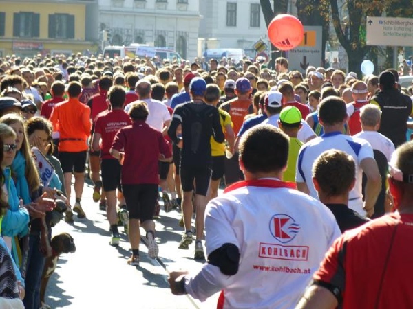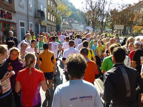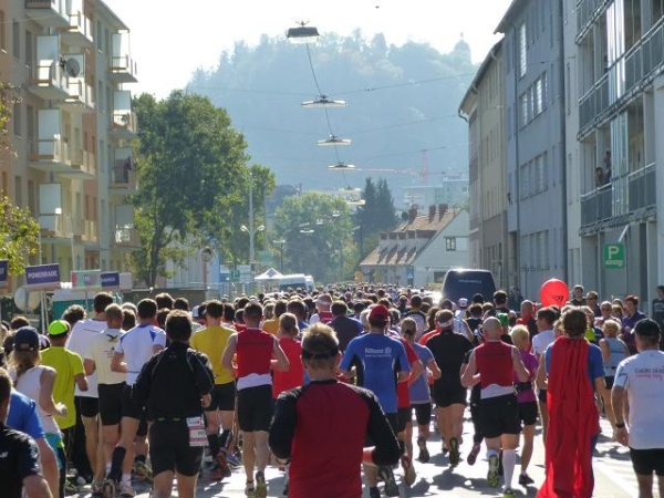 Wir streifen den Hauptplatz leider nur am Rande und zweigen sogleich nach links in die Sackstraße ab, quasi das Gegenstück der auf der anderen Seite des Hauptplatzes einmündenden Herrenstraße. Zuschauertrauben entlang der Absperrgitter begleiten applaudierend und anfeuernd unseren Weg und lassen uns den Lauf durch die Altstadt wie einen Triumphzug erleben.