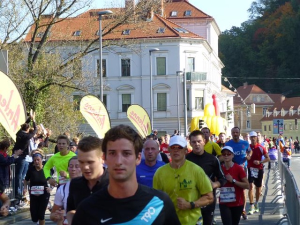 Bei km 2 sind wir bereits wieder außerhalb der Altstadt. Wummernde Musik ist schon von Weitem von der Auffahrt zur Keplerbrücke zu vernehmen. Ein gigantisches aufgeblasenes quietschgelbes Gummiradio des Senders Antenne Steiermark lenkt den Blick auf sich. Truppen wirbelnder Cheerleader-Mädels und jede Menge Zuschauer lassen keinen Zweifel aufkommen: Hier ist Party angesagt. Mit Schwung rauschen wir vorbei. Aber nicht zum ersten und letzten Mal. Denn die Strecke ist so gelegt, dass wir diesen "Hot Spot" viermal passieren werden - auch dies eine der Neuerungen des diesjährigen Laufs.