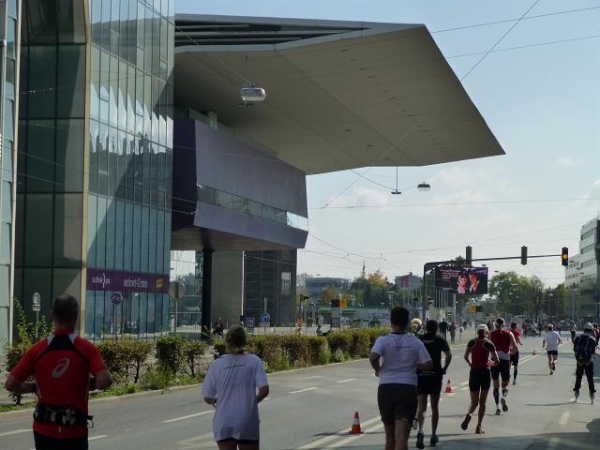 Die letzten Kilometer führen uns in mehreren langgezogenen Schlenkern durch die zentrumsnahe kleinbürgerlich geprägte Jakominivorstadt. Ein wenig vermisse ich hier die Beschilderung der einzelnen Kilometer, so wie dies auf der ersten Streckenhälfte der Fall war. Anscheinend geht man bei den Marathonläufern davon aus, dass die ohnehin nur in 5 km-Abschnitten denken können. An der Auffahrt zur Radetzkybrücke angekommen, haben wir aber endlich Gewissheit: Jetzt kann es nicht mehr weit sein. Denn von hier geht es über Joanneum- und Opernring geradewegs in Richtung Ziel auf dem Opernplatz.