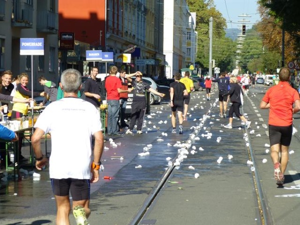 Das neue Kapitel unseres Laufs ist ein an sich bereits gekanntes, nur eben jetzt unter etwas anderen Vorzeichen: weniger Leute auf der Strecke, weniger Kraft in den Beinen. Aber ein Marathonläufer wäre eben nicht ein solcher, wäre das für ihn ein entscheidendes Kriterium. Und so ziehen wir wieder Kilometer um Kilometer in endloser Gerade auf der Theodor-Körner-/ Graben-/ Weinzöttlstraße nach Norden und ab Andritz auf ebenso langer Gerade zurück. Dafür nehme ich mir jetzt mehr Zeit, die gut organisierten Verpflegungsstationen mit ihren freundlichen Helfern heimzusuchen. Zehn Mal habe ich dazu entlang der Strecke Gelegenheit. Wasser, Powerade, Tee, Cola und Bananen stehen auf dem Programm, und das stets in der gleichen Reihenfolge, sodass man sich gleich richtig einreihen kann - ein Vorteil, der auf der zweien Streckenhälfte allerdings nicht mehr die Bedeutung wie auf der ersten hat.