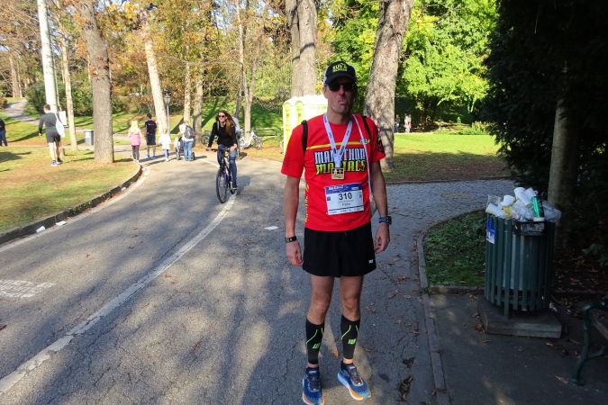 Im Ziel sind inzwischen die Essensvorräte zwar nicht aufgebraucht, aber man hat ordentlich gewütet und sich die Köstlichkeiten herausgepickt. Dennoch gibt es noch reichlich zu trinken, auch Mineralwasser mit Kohlensäure, das ich nach sportlichen Anstrengungen bevorzuge. Weckerln mit Rosinen stehen ebenfalls ausreichend zur Verfügung sowie ein breites Angebot an diversen Isogetränken. Wer sich allerdings ein echtes Bier genehmigen will, der kann dies am Puntigamer Stand gegen Bezahlung kaufen – auch Würstel und Hamburger. Falko kommt mir entgegen, wir verabschieden uns. Ein anderer Kollege erzählt, dass der Graz Marathon für ihn die Vorbereitung für den kommenden New York Marathon gewesen ist. Zur 50. Auflage in absehbarer Zeit möchte ich auch wieder dorthin reisen.