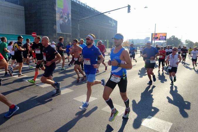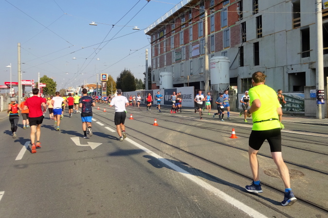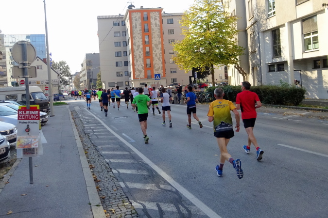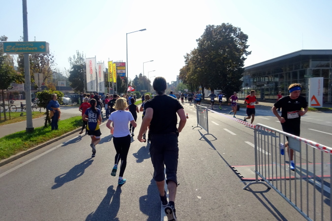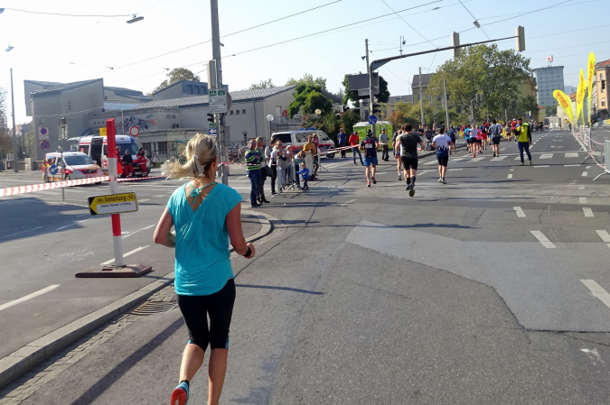 Die erste Versorgungsstelle befindet sich auf dem nun leicht ansteigenden Rückweg bei der 5 km-Tafel, etwas unterhalb des Messegeländes. Mein Blick ist auf die 3000 (!) nachstürmenden Halbmarathonläufer/innen gerichtet, die nach ihrem Start um 10 Uhr 10 nun Hasenjagd auf uns machen. Von Kilometer 1 bis zu Kilometer 8 haben wir mehr als zehnmal die Laufrichtung gewechselt – man könnte also als Betroffener sagen, dass der Marathonkurs bisher ganz schön verwinkelt ist.