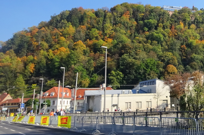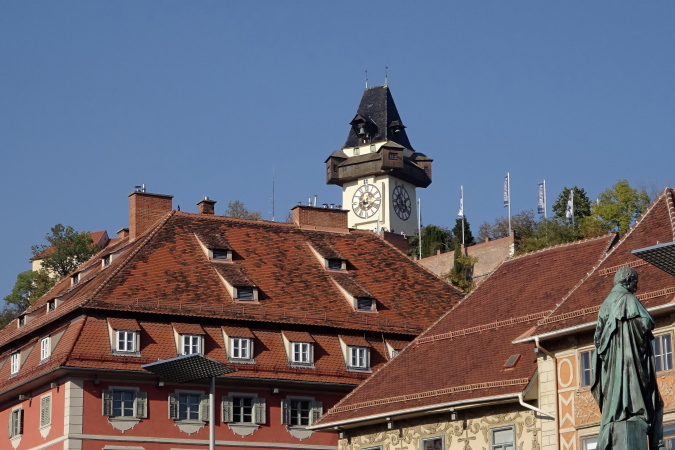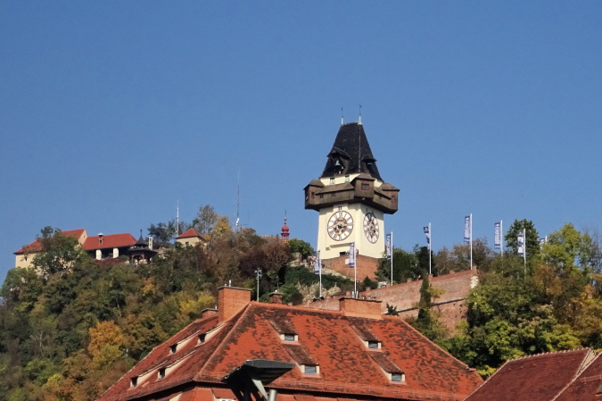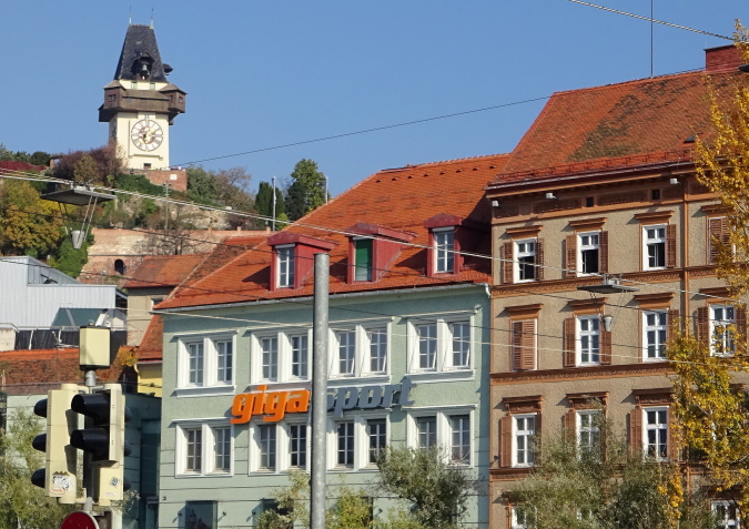 Bald geht es über die Keplerbrücke, wo der Sprecher von Antenne Steiermark dank der Musikbegleitung viel Lärm erzeugt, der Gehalt seiner Ansagen aber unreflektiert dargeboten wird, wenn er schreit: „Superleistungen, Weltklassezeiten, phantastisch…“ Ich blicke auf den 123 m hohen Grazer Schlossberg hinauf, den Uhrturm kann man auf der Hinterseite nicht sehen. Ein Foto mache ich trotzdem – das Wetter ist einfach herrlich.