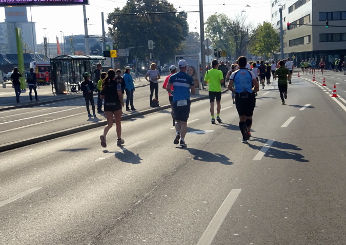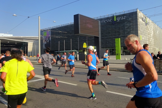 Die Messe Graz hat 2006 ihren 100-jährigen Bestand gefeiert, Publikums-, Fach- und Kongressmessen sind ihre drei wichtigen Säulen. Beim Marathon hat niemand ein Auge für die futuristischen Glasbauten, vielmehr blicken wir im hinteren Feld, wo ich inzwischen gelandet bin, auf die nun rechts auf der gegenüberliegenden Seite heranstürmenden schnellen Marathon- und Staffelläufer. Bis zur Wende beim gegenüberliegenden Graz-Liebenau-Stadion, seit 2016 nach dem Sponsor Merkur Versicherung umbenannt und die Heimstätte des Fußballklubs Sturm Graz, sind etwas mehr als vier Kilometer geschafft.
