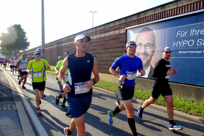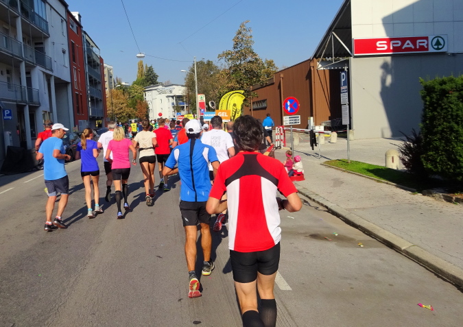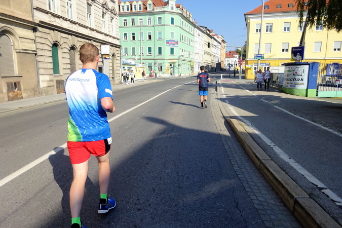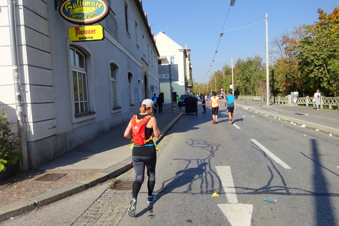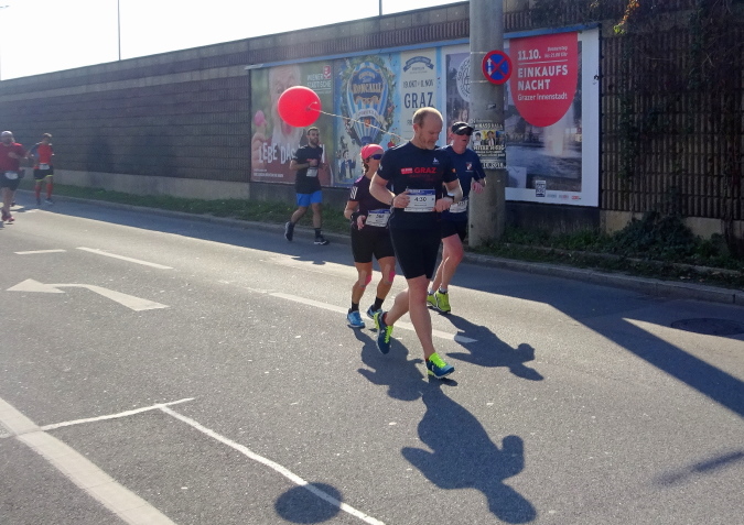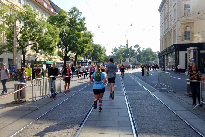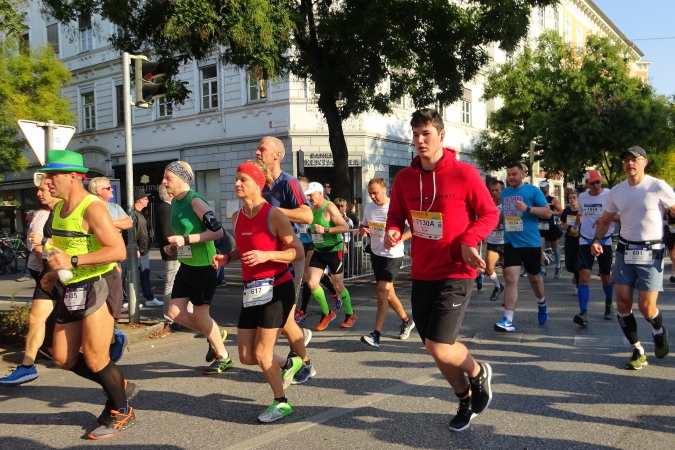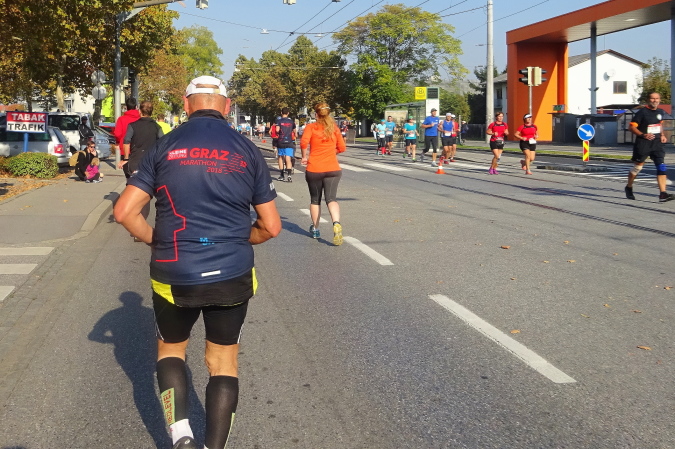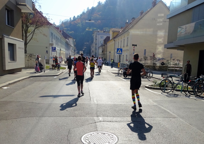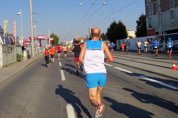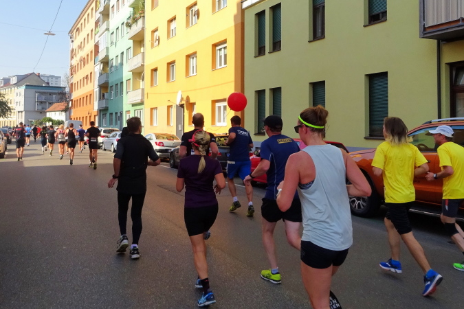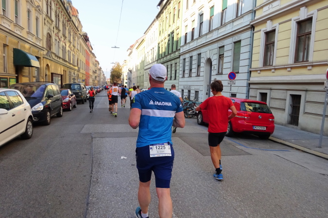 In der Wielandgasse kommt ein Läufer von hinten nach, dessen Stimme ich sofort zuordnen kann: „Jö, da Toni – wie geht’s da?“ Hans und ich kennen uns seit Jahren – und sind bei heimischen Marathons sowie in Slowenien schon öfters gemeinsam gestartet. Es würde mich nicht wundern, wenn er heute bei diesen tollen Bedingungen mit 4:20 oder darunter finishen würde. Hans legt ein höheres Tempo ein, ich bleibe bei meinen 6:20 min/km.