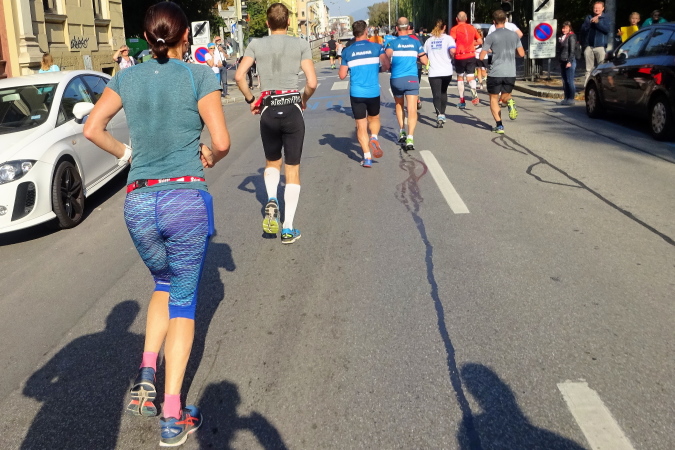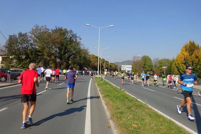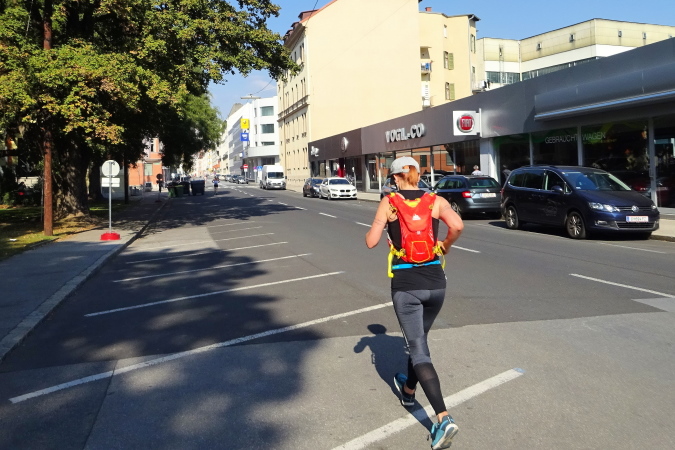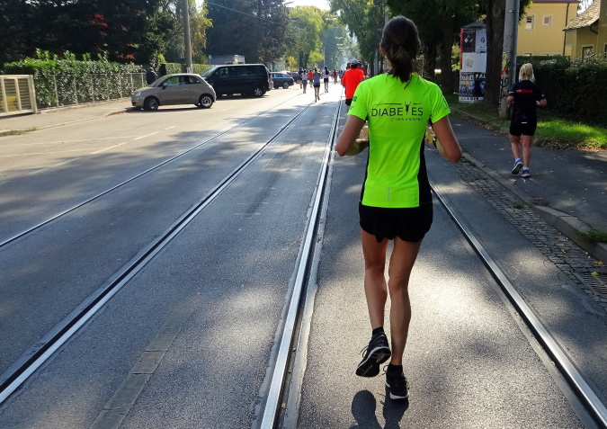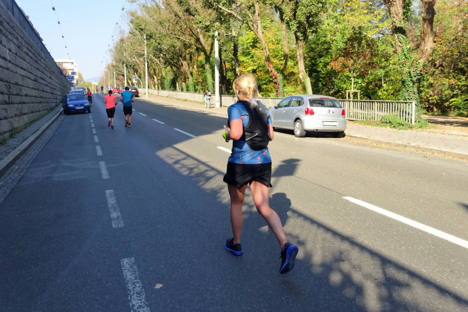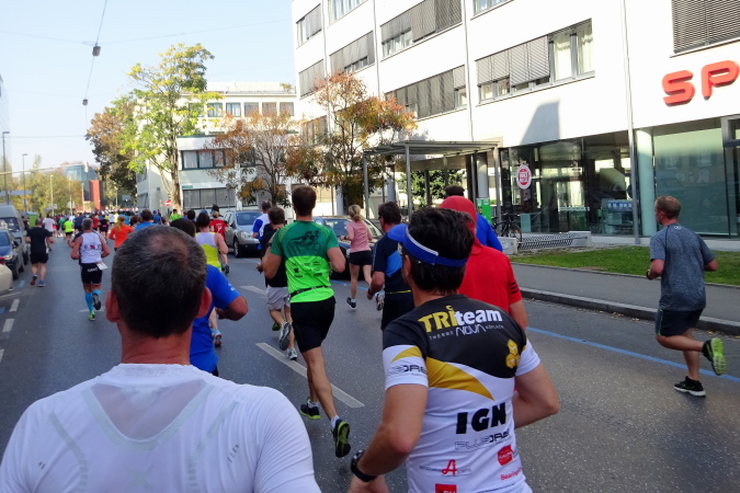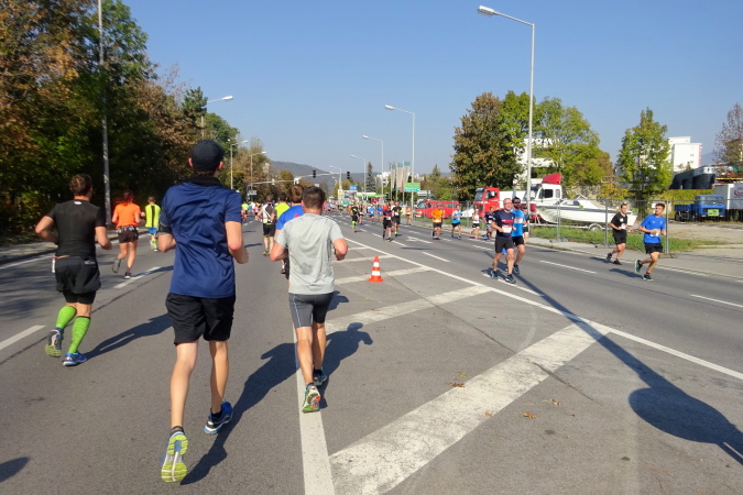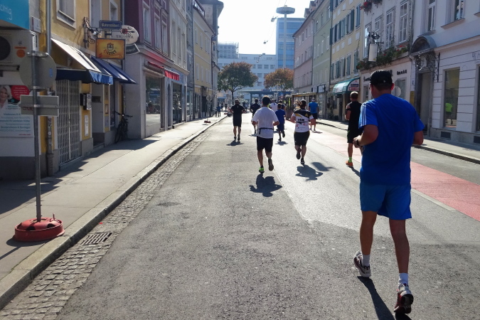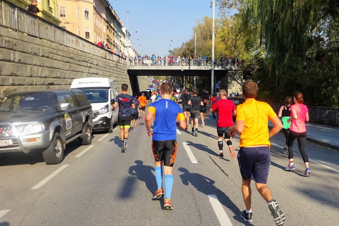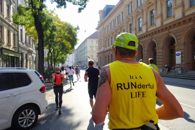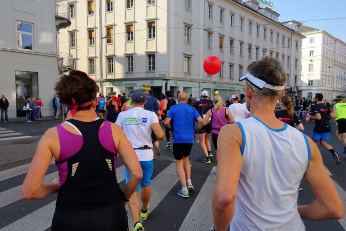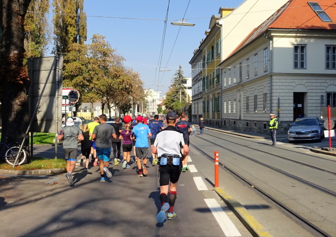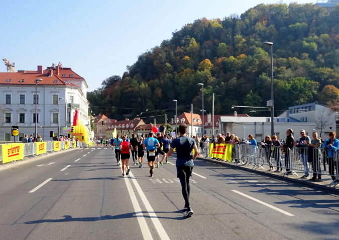 In der Wielandgasse kommt ein Läufer von hinten nach, dessen Stimme ich sofort zuordnen kann: „Jö, da Toni – wie geht’s da?“ Hans und ich kennen uns seit Jahren – und sind bei heimischen Marathons sowie in Slowenien schon öfters gemeinsam gestartet. Es würde mich nicht wundern, wenn er heute bei diesen tollen Bedingungen mit 4:20 oder darunter finishen würde. Hans legt ein höheres Tempo ein, ich bleibe bei meinen 6:20 min/km.