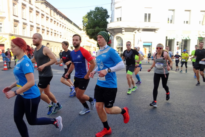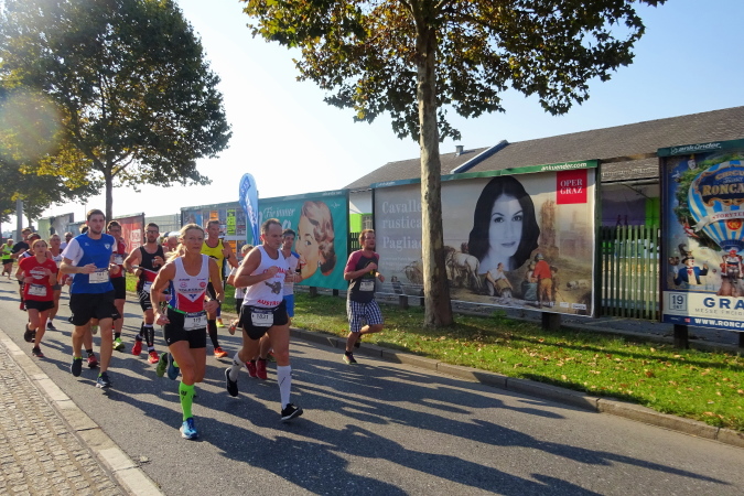 Ich stelle mich diesmal im zugehörigen Block 1 weit nach vorne, um nach dem Startschuss Bilder zu machen. Erich mit einem grünen Shirt fällt wegen des hinten aufgedruckten Sinnspruchs auf, der für Läufer/innen zum Lebensmotto werden könnte: „Run when you can, walk when you have to, crawl if you must, just never give up“. Pacemaker sind auch zu sehen, für mich wäre der 4:30er-Tempomacher zumindest bis zur Halbdistanz ein Fixpunkt. Es geht am Anfang leicht abschüssig am Opern- und Joanneumring entlang, hier wird gedrängt, gestoßen, doch nur ein Marathonanfänger lässt sich davon beeinflussen.