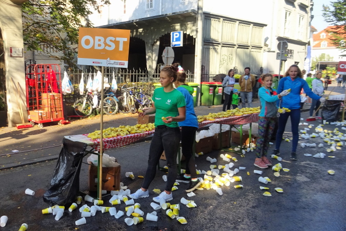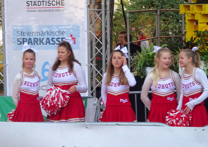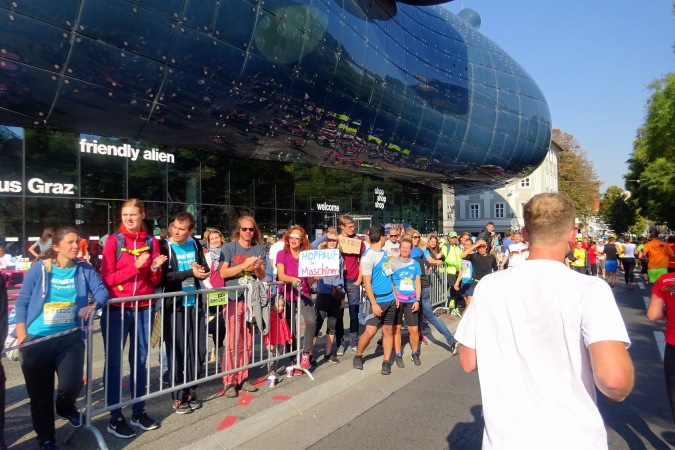 Auf der Begegnungsstrecke entlang der Grabenstraße kommt mir Falko entgegen – wir klatschen ab. Ein netter Typ, den ich hoffentlich irgendwann wieder treffen werde. Die Cheerleader-girls jubeln auch jetzt noch – einem etwa 70-Jährigen reicht eine Begleiterin eine Trinkflasche mit einem Zaubertrank, denn im Nu ist er mir wieder auf den Fersen. Aber viel spielt sich auf dem Rückweg nicht mehr ab, ich kann den einen oder anderen noch einholen. Der Moderator von Antenne Stmk nimmt von uns Schlussläufern keine Notiz mehr, er unterhält sich gerade mit Zuschauern.