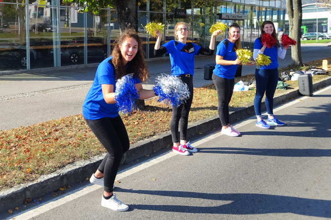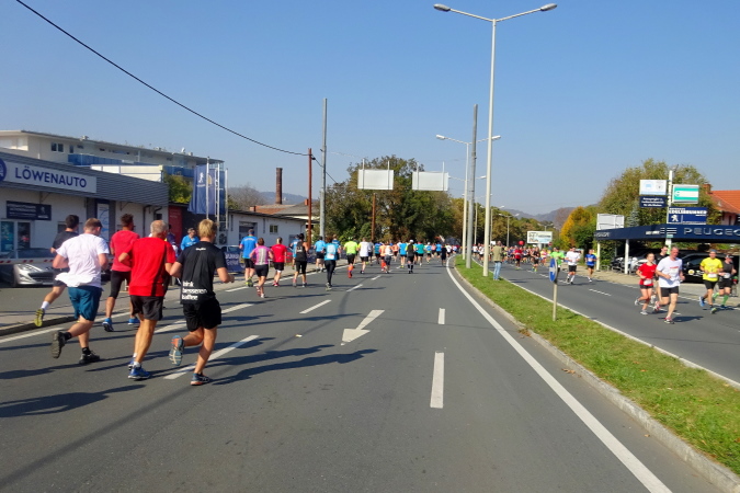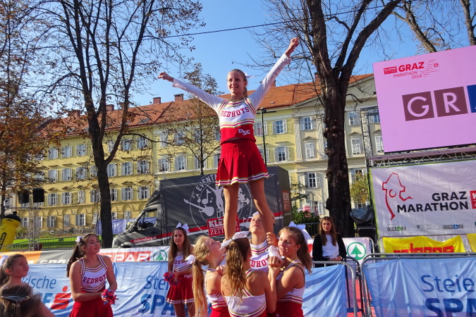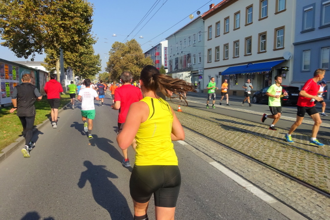 Bei Kilometer 14 wechselt der Marathonkurs in die vierspurige Grabenstraße, die als B67a heute natürlich für den Verkehr gesperrt ist. Auf der Höhe der Möbelix-Filiale folgt nach einem Kilometer eine weitere Versorgungsstelle („wüllst a a Banane?“, fragt die junge Helfern freundlich) endlich die Wende, vorbei an einer Cheerleader Gruppe, die im Überschwang alles und jeden beklatscht. Mit 1:37 bin ich gut bedient, eine (knappe) 2:15er-Zeit für den Halbmarathon könnte sich vielleicht ausgehen.