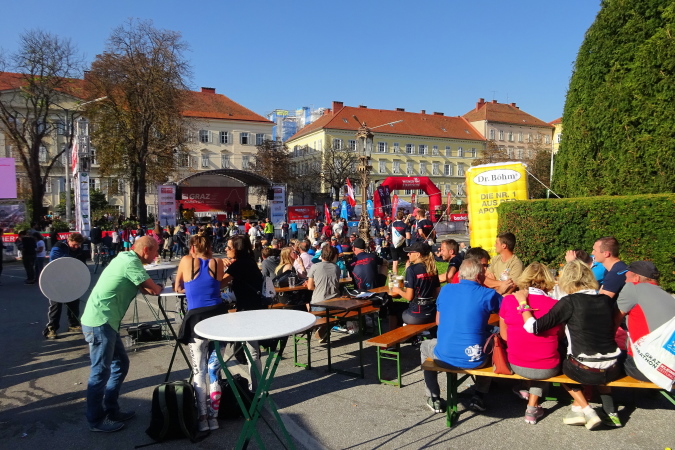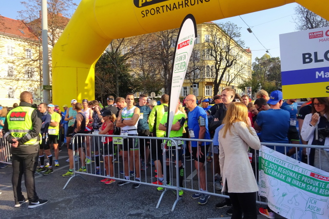 Der Weg von der Remise über die Schönaugasse zum Jakominiplatz ist mir bestens vertraut – auch andere haben ihr Auto rund einen Kilometer vom Start- und Zielbereich an der Grazer Oper geparkt. Es ist 9 Uhr 30, als ich dort eintreffe – in einer halben Stunde wird das Rennen beginnen. Während diverse Kinderläufe sowie ein 5 km-Bewerb bereits gestern durchgeführt wurden, stehen für heute neben dem Kleine Zeitung Marathon mit einem angeschlossenen Staffellauf (vier Personen, auch gemischt, bilden ein Team) über die vollen 42.195 km auch kürzere Distanzen auf dem Programm: Der Gigasport Halbmarathon (mit zusätzlich angesetzten Österreichischen Meisterschaften) aus den Startblöcken 2 und 3 ist für 10 Uhr 10 angesetzt, der Garmin Viertelmarathon wird 30 Minuten nach dem Hauptbewerb aus dem letzten Startblock 4 erfolgen. Die Startnummern sind entsprechend farblich gekennzeichnet.
