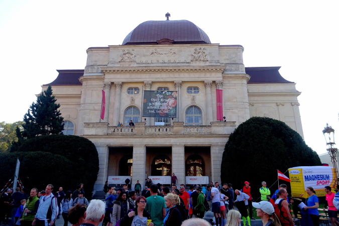 Das inzwischen alljährlich auf dem oberen Balkon an zwei Leitschienen angebrachte Plakat „Die Grazer Oper wünscht allen Läufern toi, toi, toi“ verstehen wohl auch die zahlreichen ausländischen Teilnehmer/innen. Das 1899 erbaute Gebäude im neobarocken Stil, das nach der Wiener Staatsoper das zweitgrößte Opernhaus in Österreich ist, bietet für den Graz Marathon ein imposantes Ambiente, das würdiger nicht sein könnte.