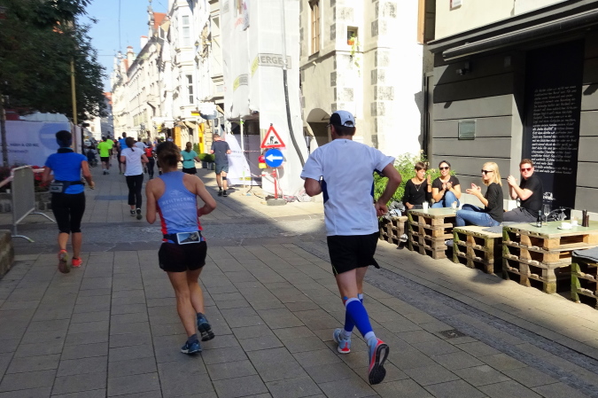 Der mit Sperrgittern abgesicherte Durchlauf durch die Grazer Innenstadt könnte verwinkelter nicht sein. Für die Zuschauer bieten sich auf den zwei Kilometern viele Möglichkeiten, nah am Geschehen zu sein. Wir nähern uns bei Kilometer 19 dem Grazer Hauptplatz, doch der Kurs führt nun wieder in Richtung Mur, nach einer erneuten Richtungsänderung hinein in die Kaiserfeldgasse. Die 20 km-Anzeige befindet sich auf der anschließenden Schmiedgasse. Wir kommen nun nochmals zum Grazer Hauptplatz mit seinen bedeutenden Bauwerken und Sehenswürdigkeiten wie bspw. dem Rathaus im Renaissancestil aus dem 16. Jh., dem Erzherzog Johann Brunnendenkmal und zahlreichen Palais und Bürgerhäusern. Auch der Blick auf das Wahrzeichen von Graz, dem auf das 13. Jh. zurückgehenden Uhrturm am Schlossberg, auf den eine Standseilbahn hinauf führt, ist grandios.