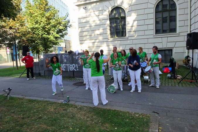 Doch die aus der Innenstadt nun den Marathonkurs auf den letzten drei Kilometern entgegenkommenden Finisher applaudieren – das gibt Auftrieb. Ich komme bei einer Sambagruppe vorbei, ein Foto ist geradezu Pflicht, denn jetzt knapp vor 14 Uhr geben die immer noch ihr Bestes. Als ich wieder am Hauptplatz bin, der Abstand zu den Nachkommenden ist groß, mache ich weitere Fotos, denn die erhoffte sub 5 h-Finisherzeit werde ich heute nicht mehr schaffen können. „Hauptsache ankommen!“ schreit eine Kollegin mit umgehängter Medaille mir zu. Recht hat sie ja, aber auch die Laufzeit sollte ein Kriterium bleiben. Mit 5:03 beende ich den 25. Graz Marathon.