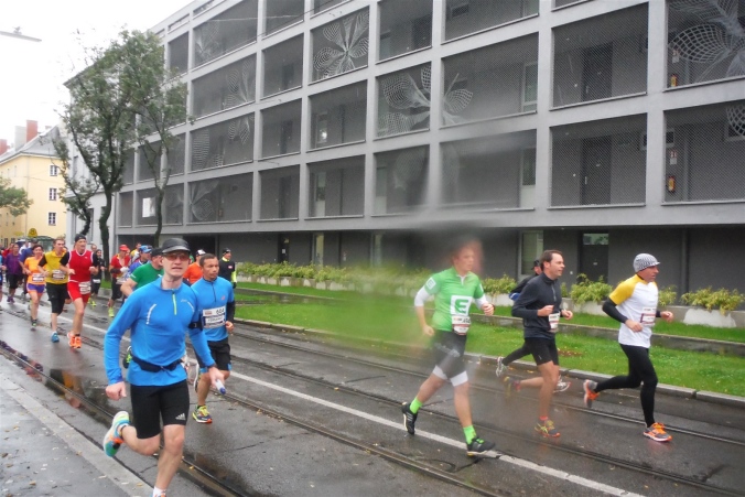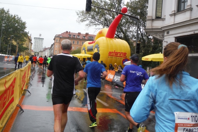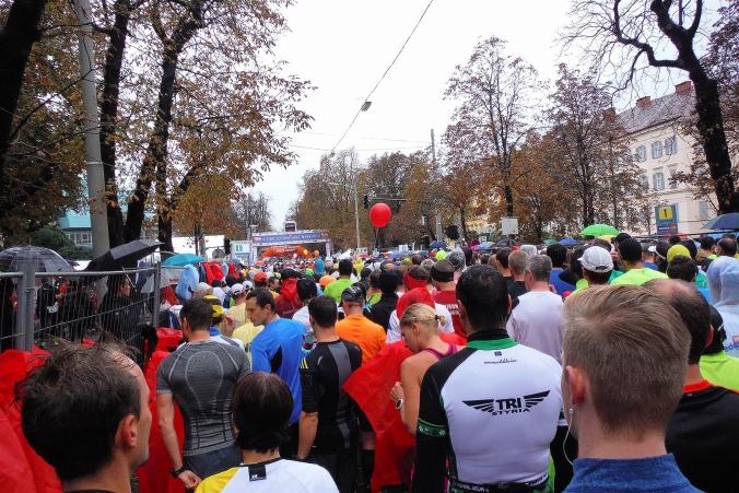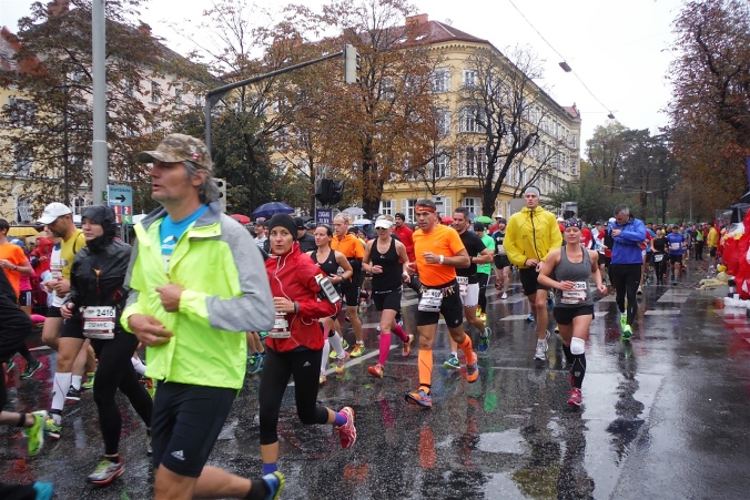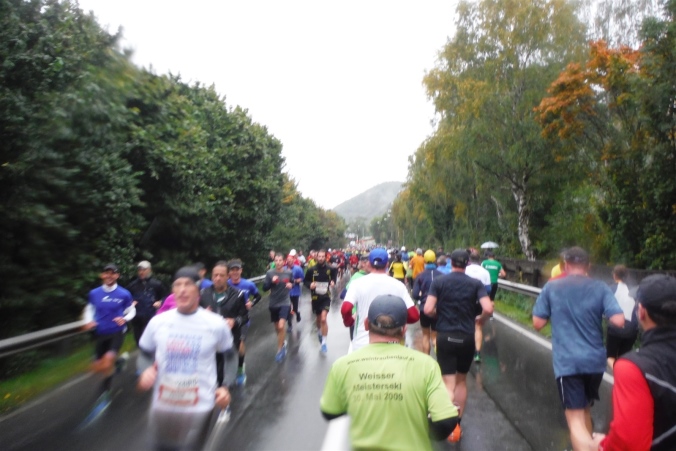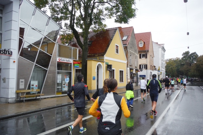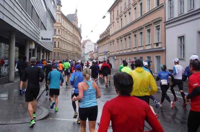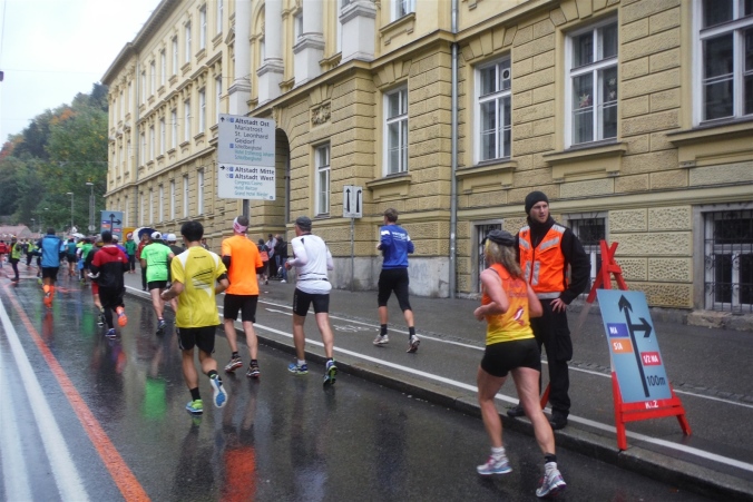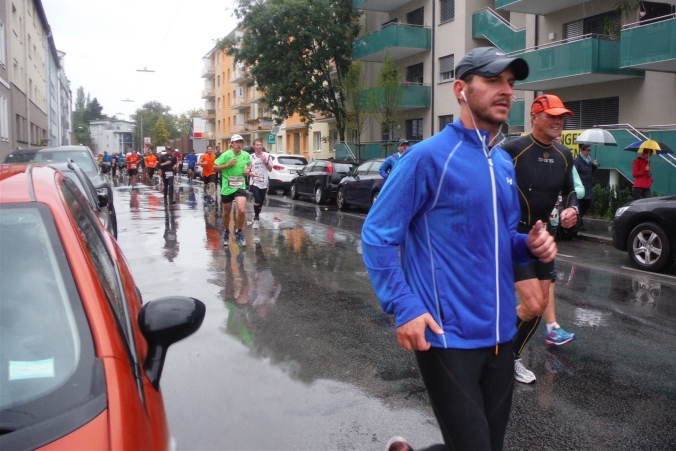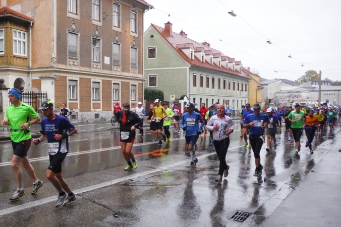 Ich werde jetzt erst mal von der mir jetzt entgegenkommenden Masse abgelenkt. Ich befinde mich also mitten im Feld. Es dauert, bis der Strom abebbt. Dennoch erblicke ich gegenüber die Nummer 300, getragen von Helmut „Linzi“ Linzbichler, der heute seinen 300. Marathon läuft. Er war bereits am Mount Everest unterwegs und hat sich den heutigen Lauf für sein Jubiläum ausgesucht, da hier seine Marathonkarriere begann. Die Anzahl von 300 Marathonläufen erscheint mir für mich utopisch. Aber wer weiß, vielleicht bin ich ja situationselastisch genug, um diese Zahl auch einmal zu erreichen. Noch brauche ich mir darüber allerdings nicht den Kopf zerbrechen. Ziel ist erstmal den heutigen Marathon erfolgreich zu bewältigen.