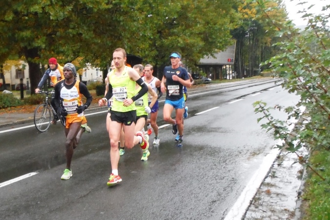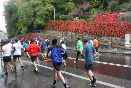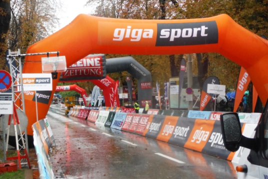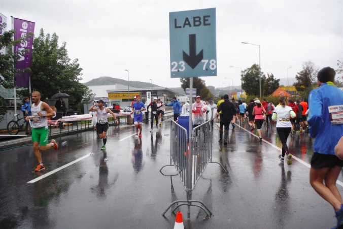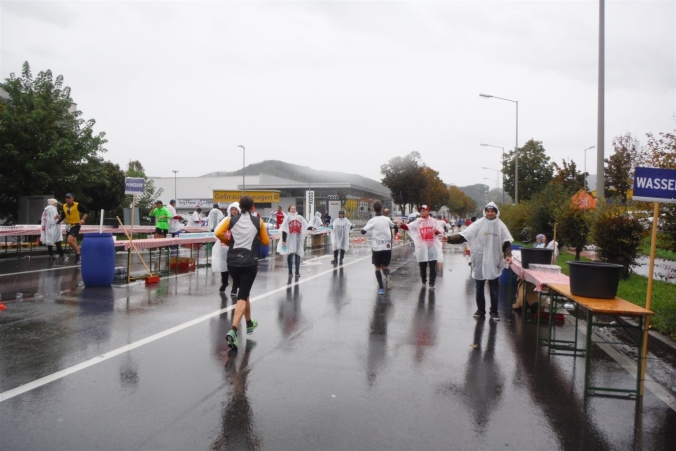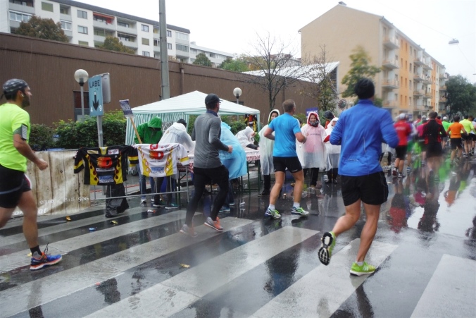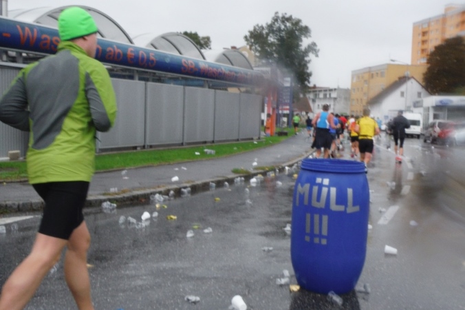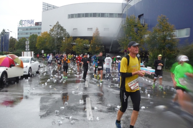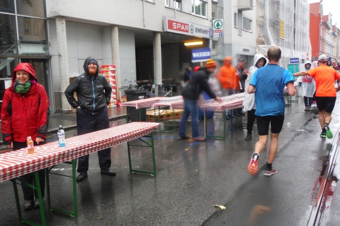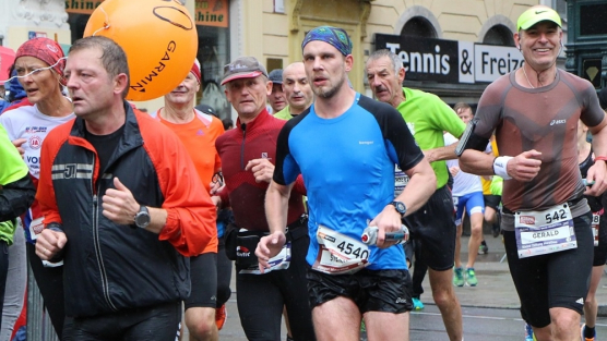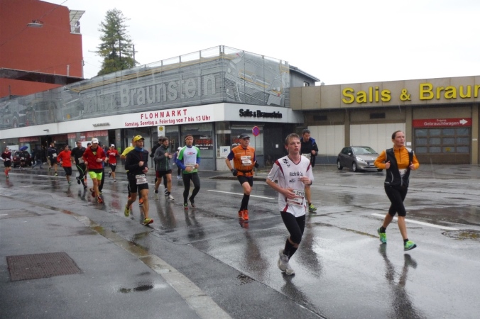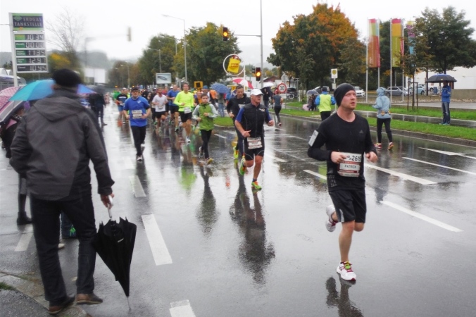 Ich werde jetzt erst mal von der mir jetzt entgegenkommenden Masse abgelenkt. Ich befinde mich also mitten im Feld. Es dauert, bis der Strom abebbt. Dennoch erblicke ich gegenüber die Nummer 300, getragen von Helmut „Linzi“ Linzbichler, der heute seinen 300. Marathon läuft. Er war bereits am Mount Everest unterwegs und hat sich den heutigen Lauf für sein Jubiläum ausgesucht, da hier seine Marathonkarriere begann. Die Anzahl von 300 Marathonläufen erscheint mir für mich utopisch. Aber wer weiß, vielleicht bin ich ja situationselastisch genug, um diese Zahl auch einmal zu erreichen. Noch brauche ich mir darüber allerdings nicht den Kopf zerbrechen. Ziel ist erstmal den heutigen Marathon erfolgreich zu bewältigen.