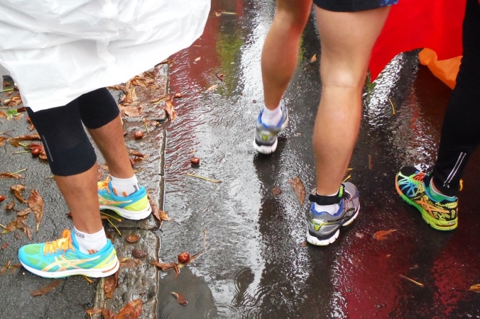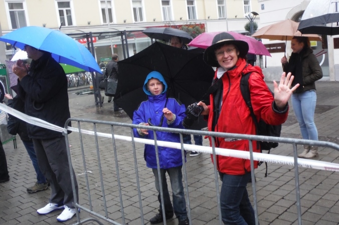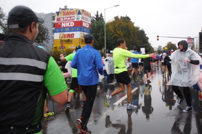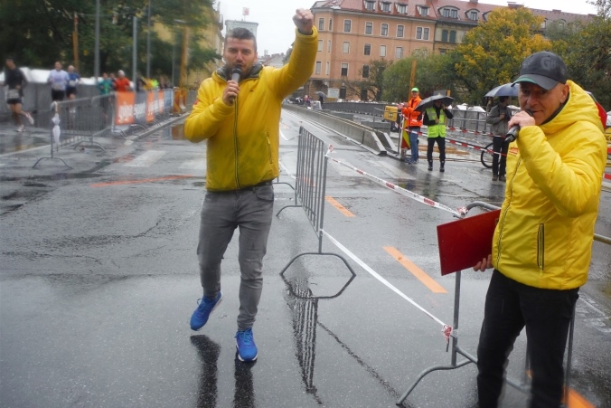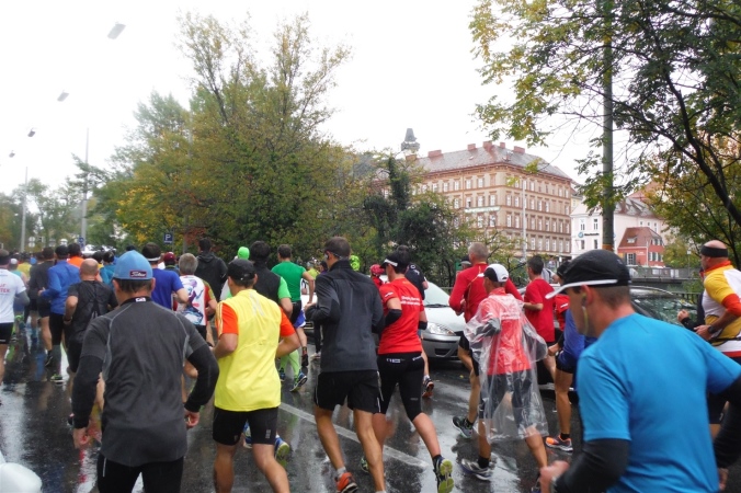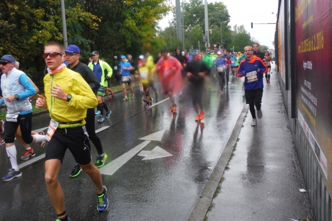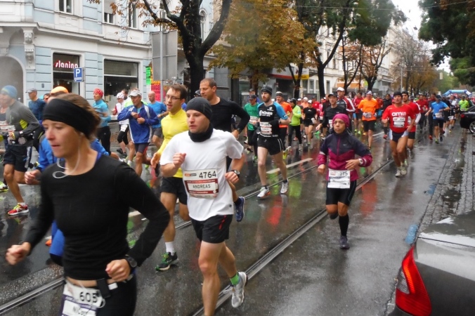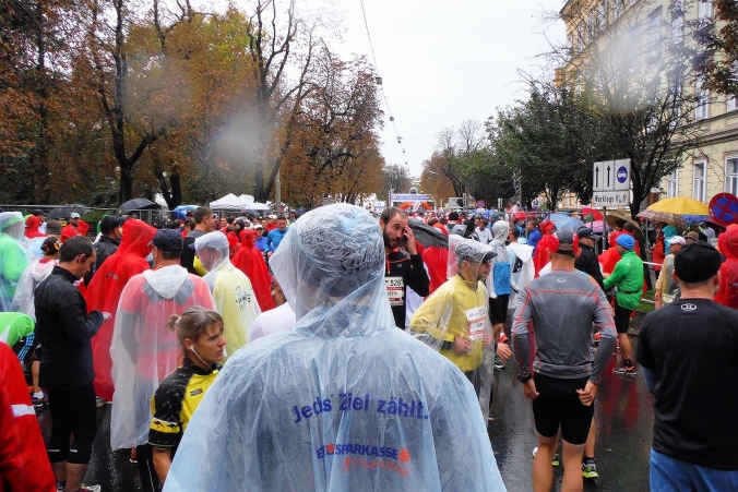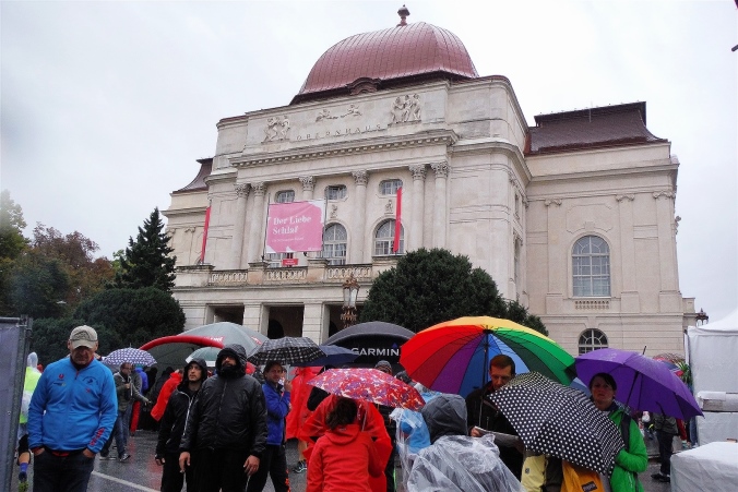 Nach erholsamer Nacht zeigt mir ein Blick aus dem Fenster, daß ich mich heute wohl auf einen situationselastischen Lauf einstellen muß. Es regnet und die Prognose für den gesamten Tag ist auch nicht besser. Damit steht mir wahrscheinlich mein erster kompletter Regenmarathon bevor. Wenigstens muß ich mir über den Weg zum Start keine Gedanken machen. Nachdem das Auto an der Wirtschaftsfachhochschule abgestellt ist, kommen wir mit dem Bus bequem zur Oper. Der Startbereich ist aufgrund des Wetters noch leer gefegt. Teilnehmer und Zuschauer suchen Schutz unter einem bunten Meer aus Regenschirmen oder nutzen wie wir den Vorbau der Oper. Es dauert nicht lang, da begrüßt uns M4Y-Kollege Herbert. Eigentlich wollte er heuer zum 4. Mal hier auf die Strecke gehen, was eine Verkühlung allerdings verhindert. Da er seinen Freund Radovan von einer Teilnahme überzeugt hat, macht er wenigstens den Chauffeur.