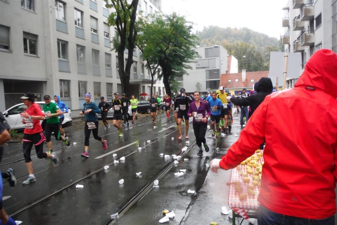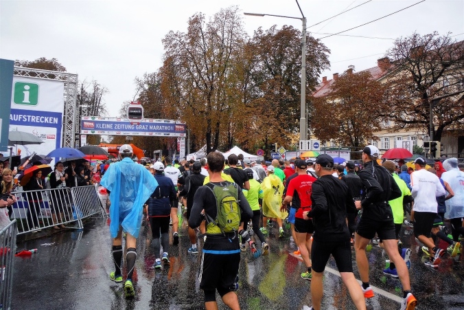 Direkt vor dem Start interviewt der Moderator den österreichischen Verteidigungs- und Sportminister Gerald Klug. Dadurch lerne ich das Wort des Jahres 2014 in Österreich kennen, denn er hat es ausgesprochen. „Situationselastisch“ bedeutet, daß eine ansonsten alltägliche Situation sich auch einmal anders entwickeln kann. Das trifft diesmal auch auf mich zu. Die Anreise trete ich mit meiner Familie bereits am Samstag an. Ungewöhnlich ist dabei der Zeitpunkt, denn aufgrund der langen Anfahrt fahren wir bereits um kurz nach 5 Uhr los, um sicher zu stellen, bis zum offiziellen Schluß der Startnummernausgabe um 18.00 Uhr in der steirischen Landeshauptstadt angekommen zu sein. Der Verkehr auf der Autobahn meint es gut mit uns und kontrolliert wird an der Grenze nur in der Gegenrichtung, so daß wir kurz nach 15.00 Uhr die Marathonmesse erreichen.