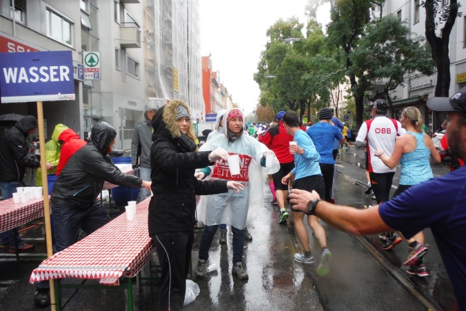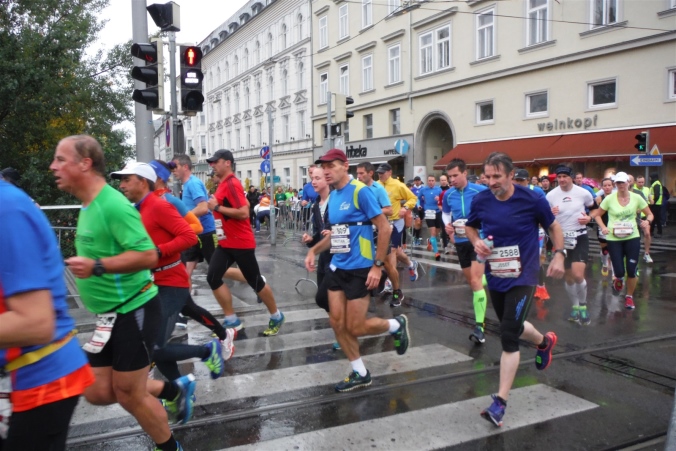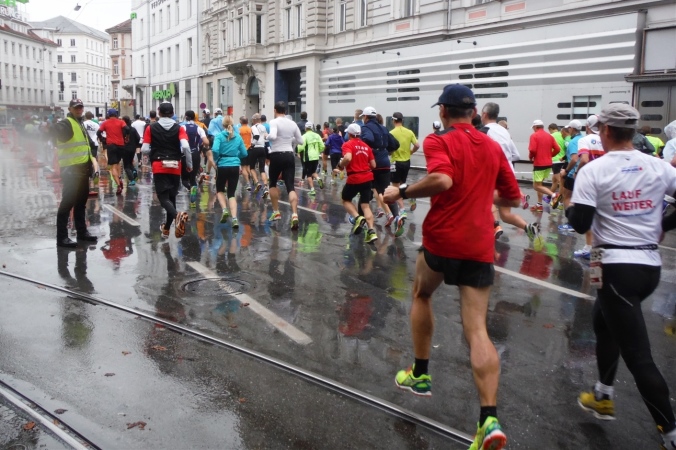 Ich begebe mich kurz vor dem Start allein in den 2. Startblock. Den konnte ich mir am Vortag selbst aussuchen, indem ich meine geplante Zielzeit unter 4 Stunden bei der Startnummernausgabe angeben konnte. Sehr sinnvoll, denn aufgrund des Trainingsstandes können die Läufer sich meistens selbst am besten einschätzen. Nach dem Verklingen der Bundeshymne steigt die Spannung. Die letzten Sekunden werden gemeinsam herunter gezählt und pünktlich wird die Elite und der 1. Startblock auf die Strecke gelassen. Um das riesige Feld zu entzerren, wird der 2. Startblock etwas später gestartet. Sinnvoll ist das allemal, denn gemeinsam mit uns Marahonis starten die Staffeln und die Halbmarathonis, mit denen wir uns die erste Hälfte des Rennens die Strecke teilen. Das sind bei heuer insgesamt über 10.000 Teilnehmern immer noch etwa 4.000 Läuferinnen und Läufer.