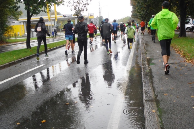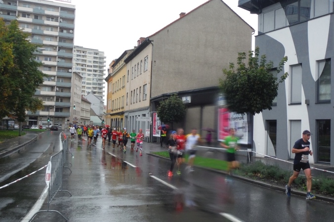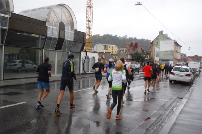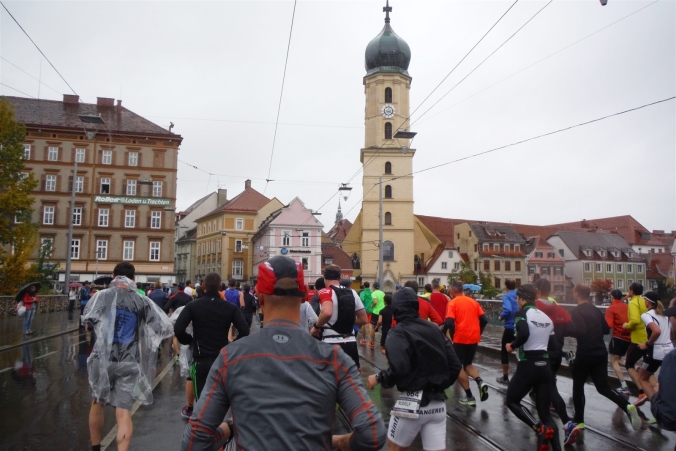 Die ersten Kilometer laufe ich so noch dicht gedrängt in der Masse. Das erfordert schon jetzt erhöhte Konzentration, denn nebenbei versuche in den sich bietenden Lücken auch noch den zahlreichen Pfützen auszuweichen. Wenn ich schon jetzt nasse Füße bekäme, weiß ich nicht, wie sich das noch ausgeht. Nach einem knappen Kilometer quere ich über die Radetzkybrücke erstmals die Mur, die mich die meiste Zeit begleiten wird. Hier ist der aus den hohen Tauern kommende Nebenfluss der Donau noch jung, führt daführ aber schon kräftig Wasser.