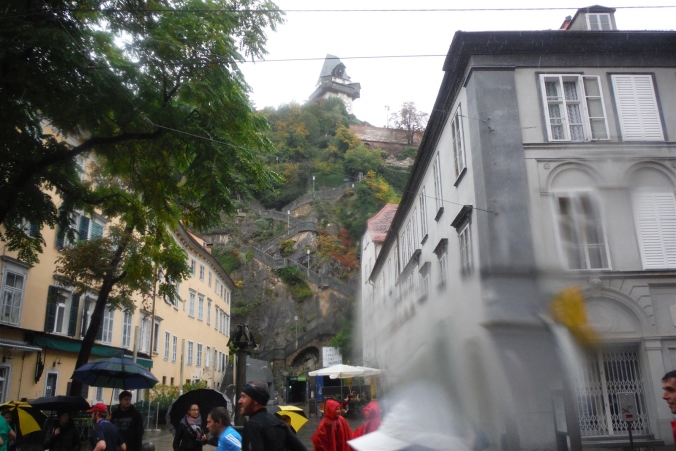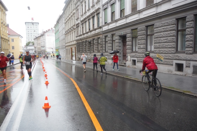 Zurück auf den Boden der lokalen Politik holt mich der Hauptplatz. Ein Blick nach rechts zeigt mir das Rathaus von 1878. Die Strecke schwenkt hier nach Norden in die Sackstraße. Zwischen zwei Häusern auf der rechten Seite tut sich auf einmal der Grazer Schloßberg auf. Oben thront der Uhrenturm, unten führt ein Stollen tief in den Berg. Im zweiten Weltkrieg dienten diese als Luftschutzbunker. Ich folge der Strecke bis KM 3 um den Grazer Schloßberg herum. An der Keplerbrücke heizt uns Radio Steiermark bereits mit heißen Rhythmen ein. Dreimal mal noch komme ich im Verlauf des Rennens hier vorbei.