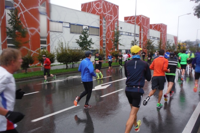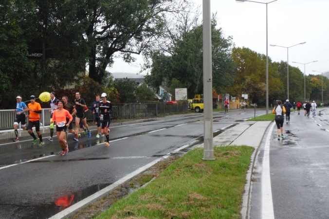 Nach einem großen Linksbogen biege ich nach 3,5 KM auf die Theodor-Körner-Straße ein. Bis KM 7,5 führt die Strecke ziemlich gerade nach Nordwesten. Das Feld ist immer noch dicht gedrängt. Das überfordert sogar die hier installierte Tempomessanlage. Wenn man der Anzeige Glauben schenkt, bin ich hier mit 144 Kilometern pro Stunde unterwegs. Könnte ich tatsächlich einen neuen Marathonweltrekord aufstellen? Da würde die Realität aber mal situationselastisch korrigiert. Die Wirklichkeit sieht natürlich ganz anders aus. Da bekomme ich ab KM 5 die führenden Läufer auf der Gegenseite zu sehen, denn bis KM 10 folge ich jetzt einer Begegnungsstrecke. Schon jetzt liege ich also weit zurück, aber die Schnelligkeit ist ja nicht mein Anspruch. Ich beobachte vielmehr, wie die Masse der entgegenkommenden Läufer und Läuferinnen größer wird. Erst tröpfchenweise kommen sie mir entgegegen, schließlich wie eine große Woge. Mit dabei die Pacemaker für 3:45 Stunden. Jetzt kann es für mich nicht mehr weit bis zum nörlichen Wendepunt sein. Und tatsächlich, schon habe ich ihn erreicht. Die Dance Production empfängt mich enthusiastisch. Noch ist die Stimmung gut. Mal sehen, ob dies auf der zweiten Hälfte immer noch so ist, denn der Regen wird auch ihnen zusetzen.