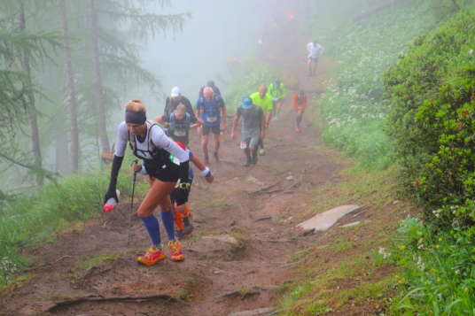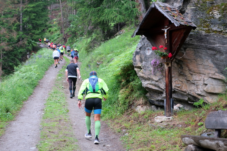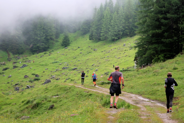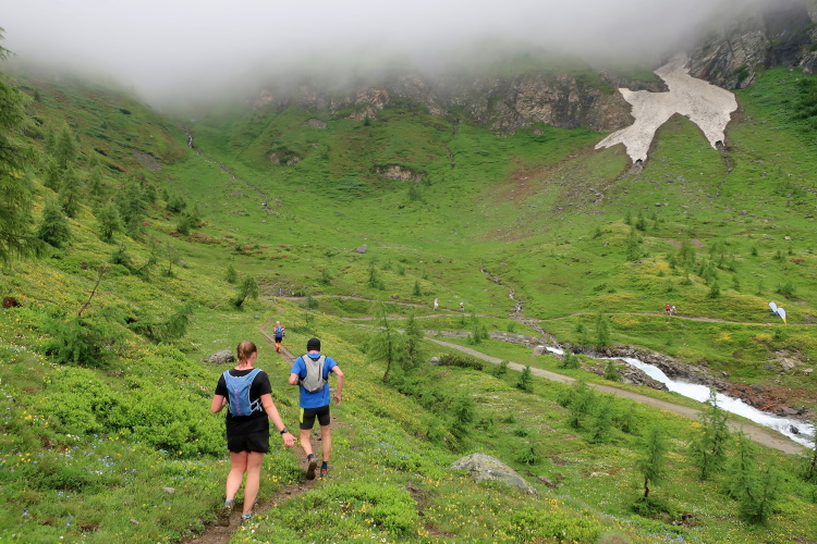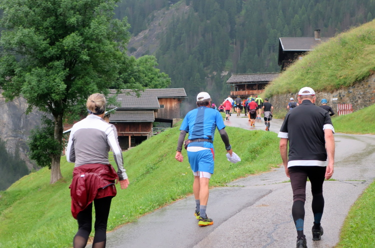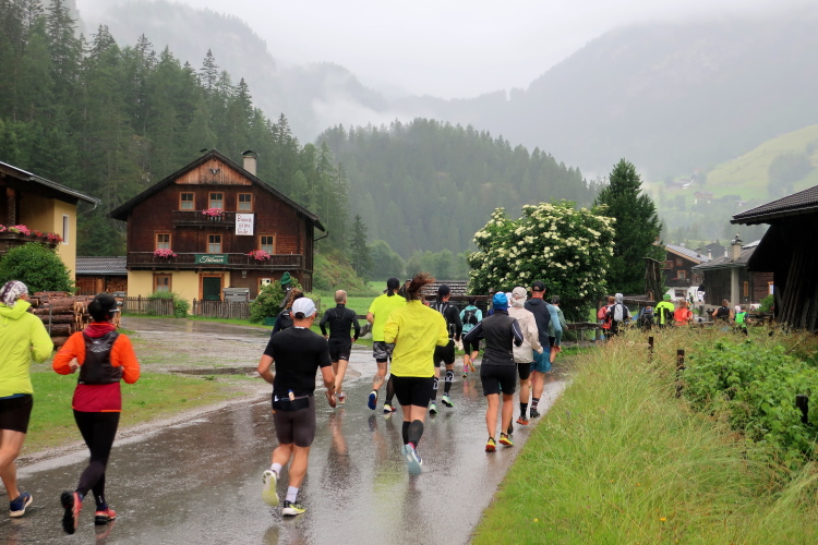 Auf Asphalt mit reichlich Platz geht es zunächst flach entlang der Möll durch üppiges Grün dem Talschluss entgegen. Entspanntes Einlaufen ist angesagt und das erste Schild, mit dem jeder einzelne Kilometer bis zum Ziel markiert ist, flott erreicht. Auf Asphalt geht es auch jetzt noch weiter, nun aber erstmals konditionstestend in langen Serpentinen den Hang hinauf. Schon diesen Test bestehe ich nicht, aber damit bin ich zum Glück nicht allein. Über Almen und vorbei an einsamen Gehöften gewinnen wir schnell an Höhe. Mystisch hängen die Wolkenschwaden im Gebirgswald über und auch unter uns. In der Ferne fällt ein letzter Blick auf Heiligenblut.