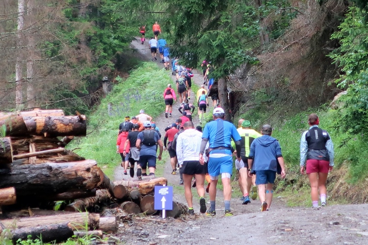 Über einen Forstweg setzt sich unser Kurs stetig bergauf führend fort. Der Nadelwald schließt uns blickdicht ein und öffnet sich erst wieder, als ich nach 3,7 km auf der Sattelalm (1.606 m üNN) die erste von vier Verpflegungsstationen entlang der Strecke erreiche. Wasser, Iso, Bananen bilden das effektive Standardrepertoire.
