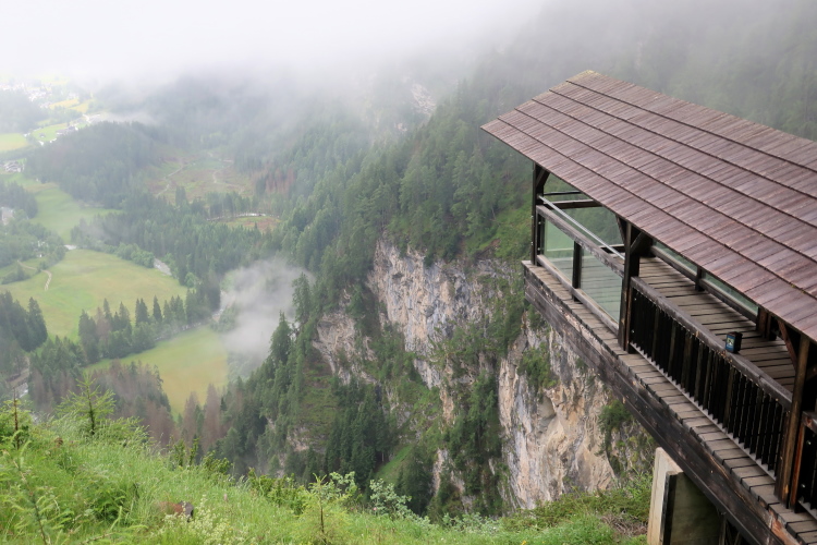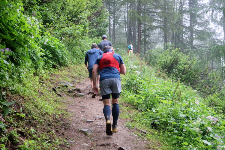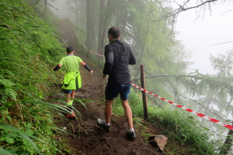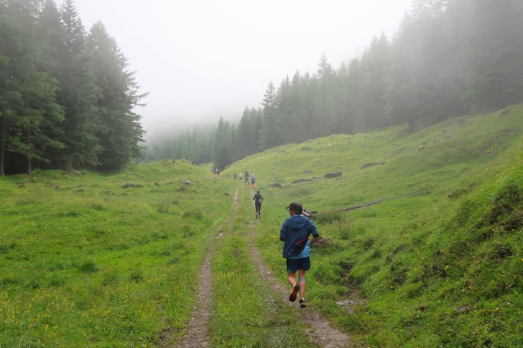 Durch dichten feuchten Wolkennebel führt uns die nächste Etappe. Geradezu erholsam ist der Crosslauf in leichtem Auf und Ab über die Hochalm, vorbei an der in die Bergeinsamkeit eingebetteten Bricciuskapelle. Aber es ist läuferisch nur die Ruhe vor dem Sturm.