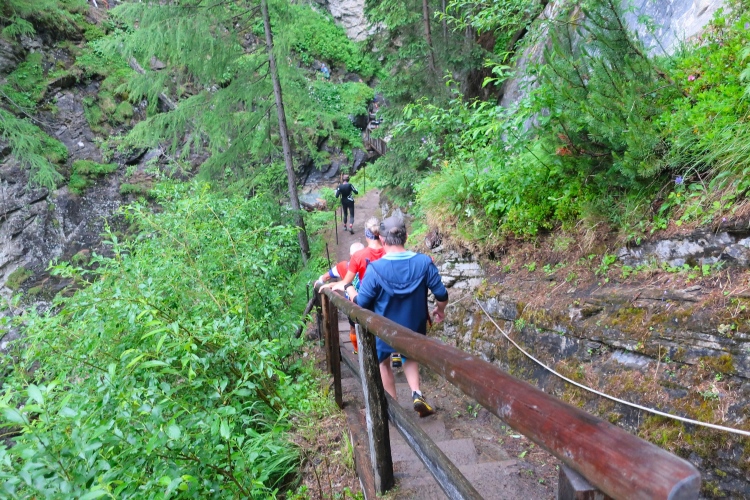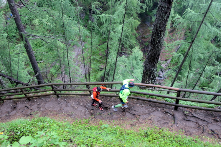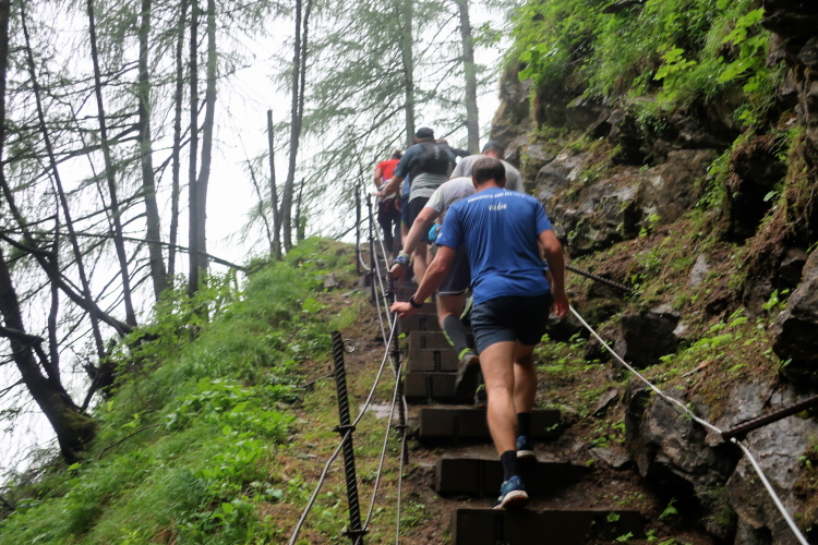 Das Finale steht an. Und was für eines. Hoch oben im Hang ist das Ziel deutlich auszumachen: die Kaiser Frank Josefs-Höhe, in fast 2.400 Metern Höhe gleich einem Adlerhorst scheinbar uneinnehmbar im Fels thronend. Während man die steilen Wegpassagen in ihrer Länge bislang nie von vornherein abschätzen konnte, bekommt man hier die zu bewältigende Aufgabe schonungslos offengelegt. Und so reihe ich mich ein in die Karawane der erschöpft im Zickzackkurs über 522 steile Stufen nach oben schleichenden Läufer.