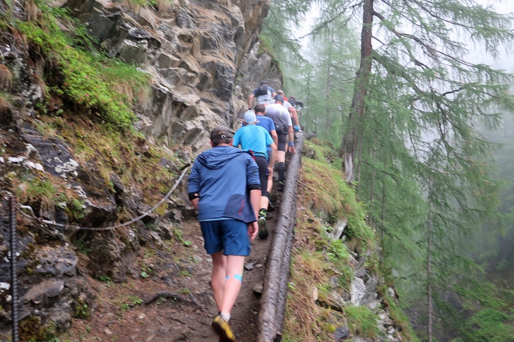 Die Trogalm markiert den Eintritt in das Gletschertal der Pasterze. Vom selbigen ist im kühl-feuchten Wolkengebälk allerdings weder etwas zu sehen noch auch nur etwas zu erahnen. Umso mehr können wir uns unserem Pfad widmen. Gut laufbare flachere Passagen und extreme Steigungen wechseln einander ab und fordern durchaus die Konzentration. Steine, Wurzeln, Löcher und reichlich schlammige Passagen verzeihen keine Unaufmerksamkeit.