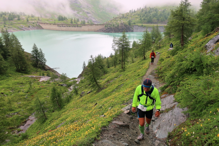 Im Galopp eile ich durch üppige Blumenwiesen der nach 9,1 km nahe dem See positionierten dritten Verpflegungsstelle entgegen. Mit ihren bunten Schirmen und Fahnen setzt sie einen Farbtupfer in die weite einsame Landschaft. Durch die Hangflanke an der Rückseite des Sees geht es nun verstärkt wieder bergan. Immer weniger trüben Wolken den Blick auf die Berghänge um den See herum und besetzen rasch weiterziehend nurmehr die Höhenlagen.