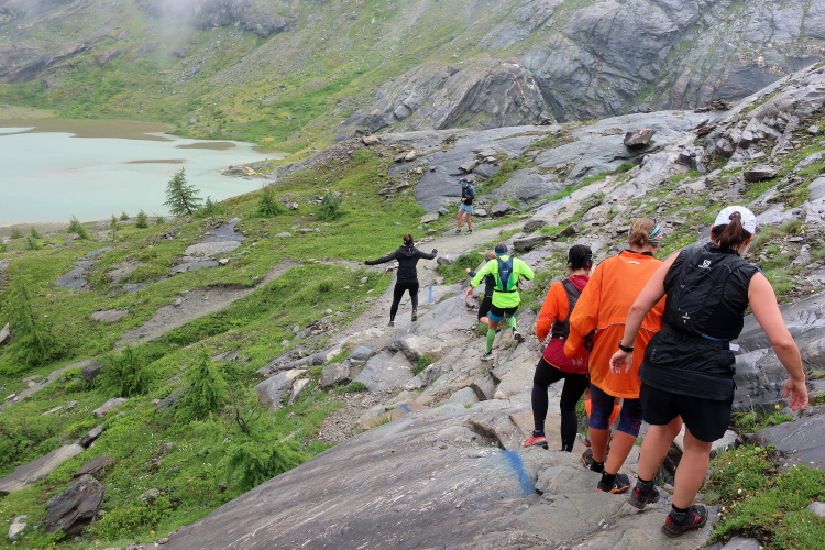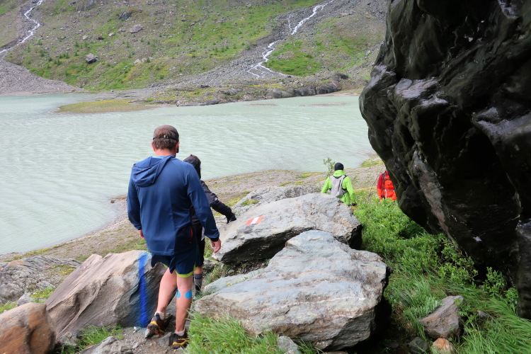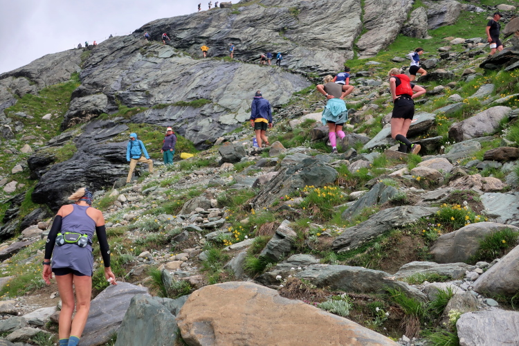 Vom Ufer weg führt der Pfad nun direkt dem steilen Abhang entgegen. Vom Gletscher rund geschliffene Felsen jeglicher Größe bedecken den Boden. Bodenmarkierungen weisen den Weg durch das Felsenlabyrinth. Auch hier kommen immer mal wieder meine Hände als Stütze zum Einsatz. Schnell gewinne ich wieder an Höhe, aber ebenso schnell lässt mein Tempo nach. Weithin sichtbar signalisieren bunte Fahnen im immer heftigeren Wind nach 11,8 km einen letzten Verpflegungsposten inmitten der Felsenhaufen. Höchsten Respekt zolle ich den Helfern, die den Posten in diesem unwegsamen Gelände eingerichtet haben.