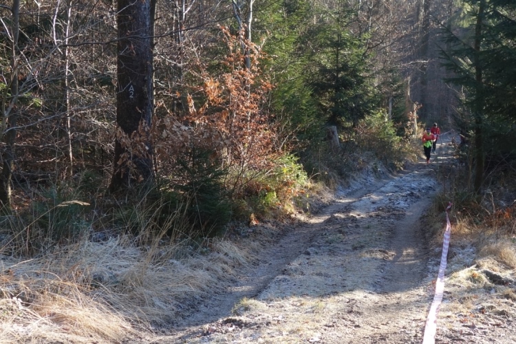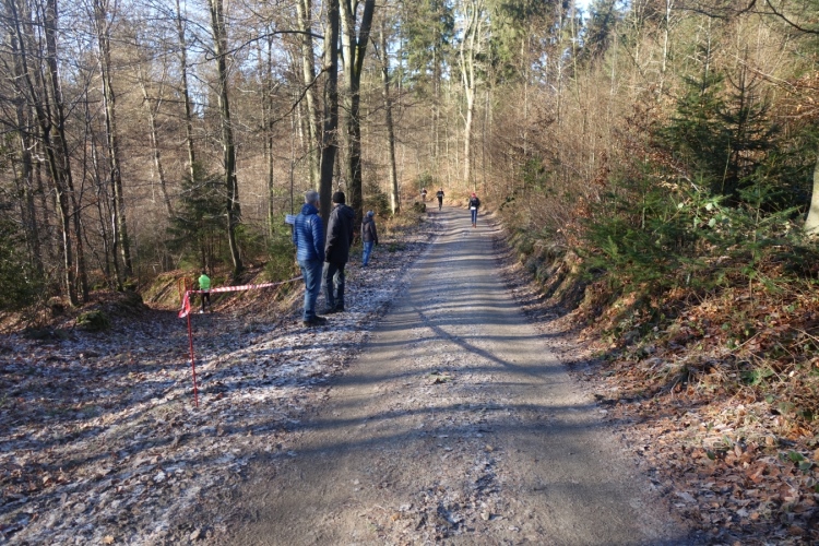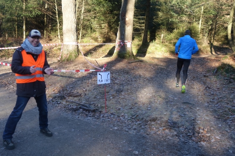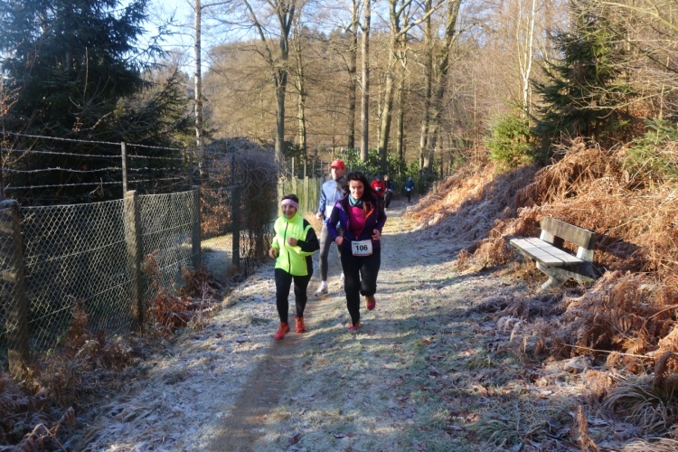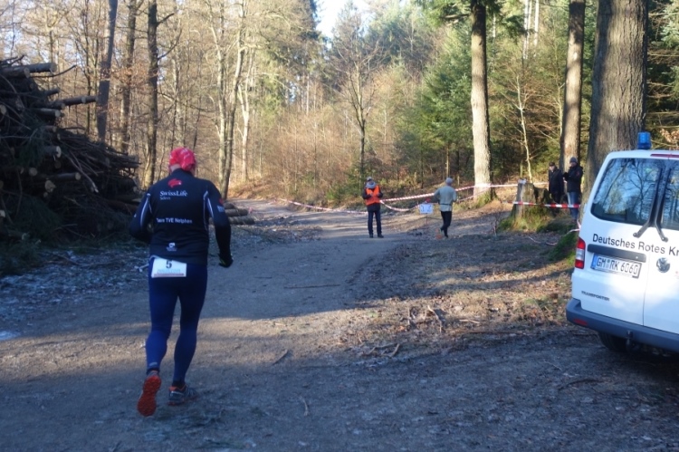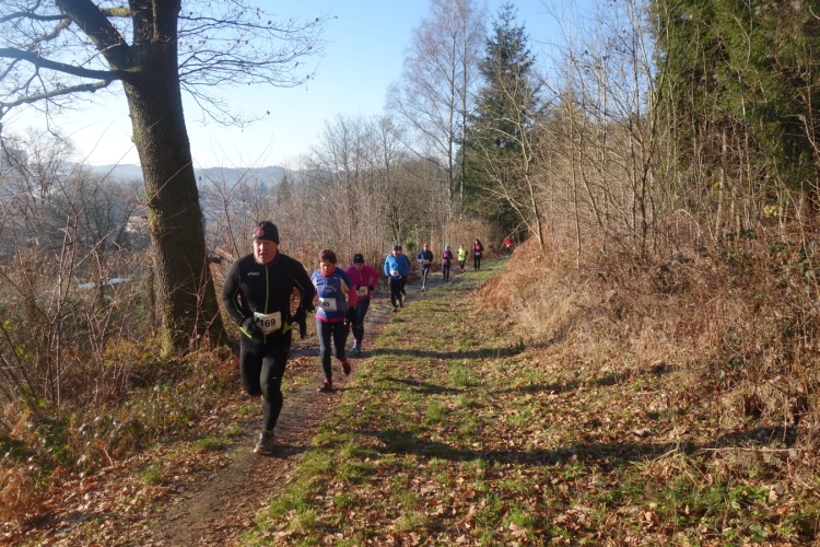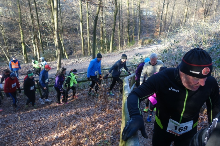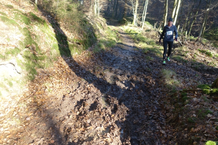 Wieder kommen uns für ein kurzes Stück Läufer entgegen.Auch Hansi aus Engelskirchen stürmt mir entgegen dem Ziel zu. Ich biege nach rechts ab. Es geht zum Schlammpfad. Noch ein Höhepunkt der Strecke. Allerdings ist der Pfad heute durch den Frost kaum schlammig. Das war im letzten Jahr anders.