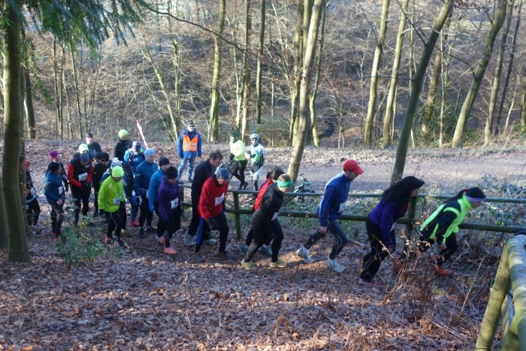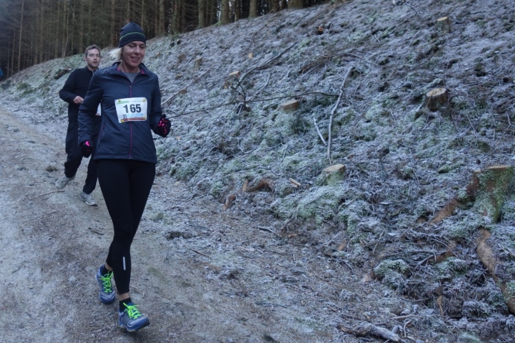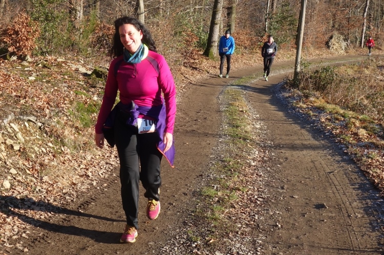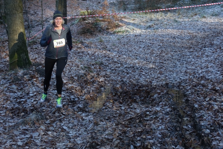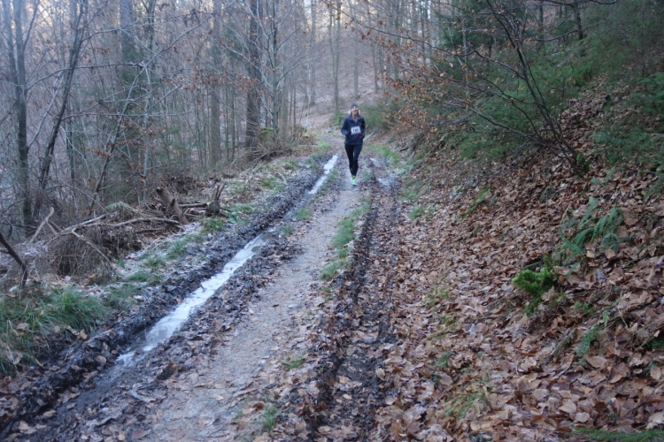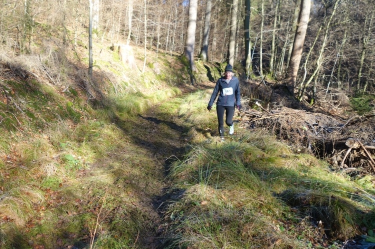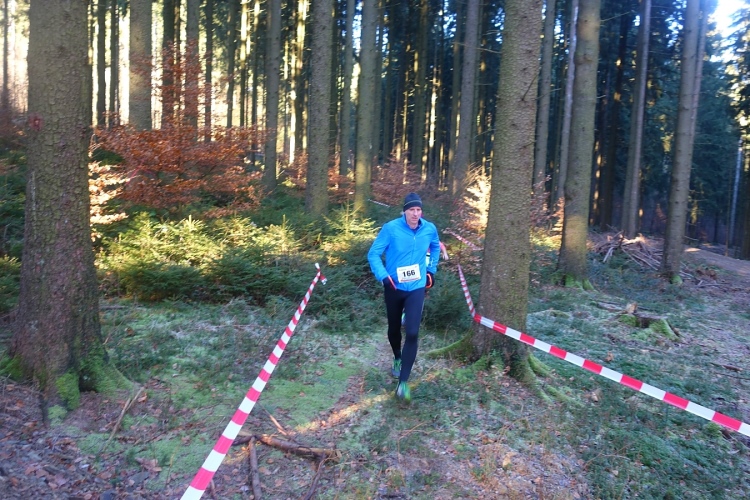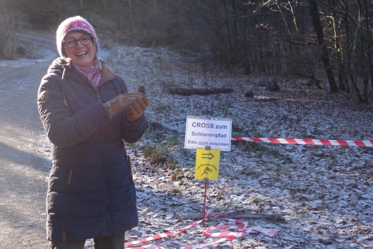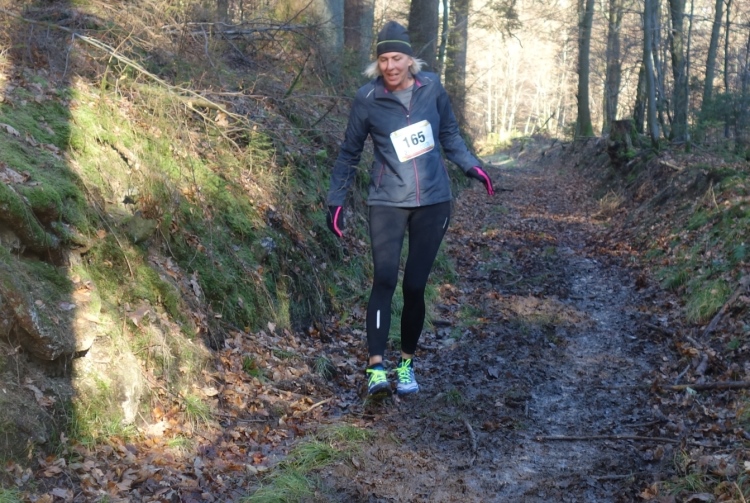 Wieder kommen uns für ein kurzes Stück Läufer entgegen.Auch Hansi aus Engelskirchen stürmt mir entgegen dem Ziel zu. Ich biege nach rechts ab. Es geht zum Schlammpfad. Noch ein Höhepunkt der Strecke. Allerdings ist der Pfad heute durch den Frost kaum schlammig. Das war im letzten Jahr anders.