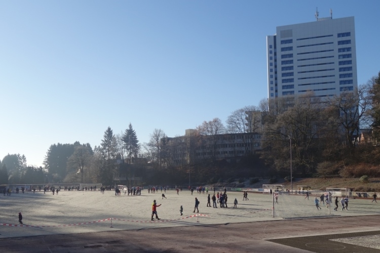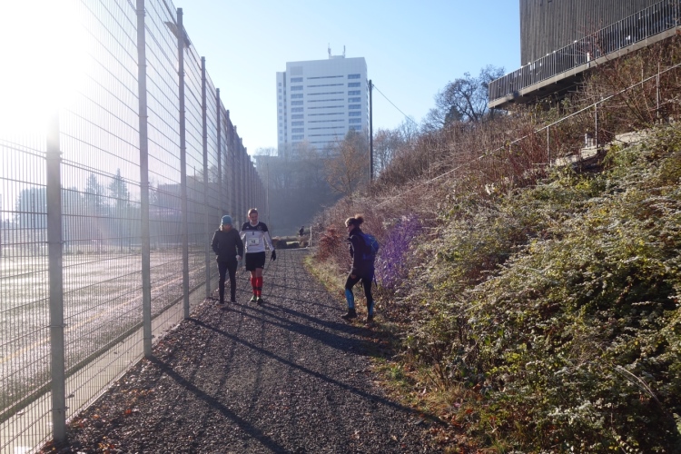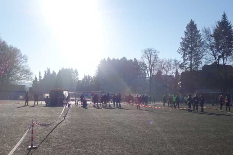 Dann heißt es einlaufen. Der Boden des Kunstrasenplatzes ist dicht mit Reif bedeckt. Es ist rutschig. Da gilt es gleich: Obacht beim Laufen. Ich merke direkt, dass ich heute die falschen Schuhe anhabe. Egal, es kommt mir nicht auf die Zeit an. Schöne Fotos sind mir lieber und Spaß will ich auch haben.