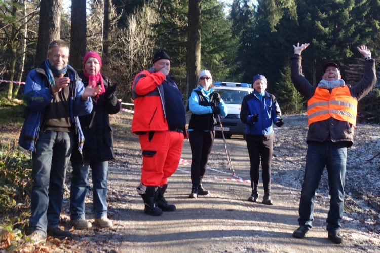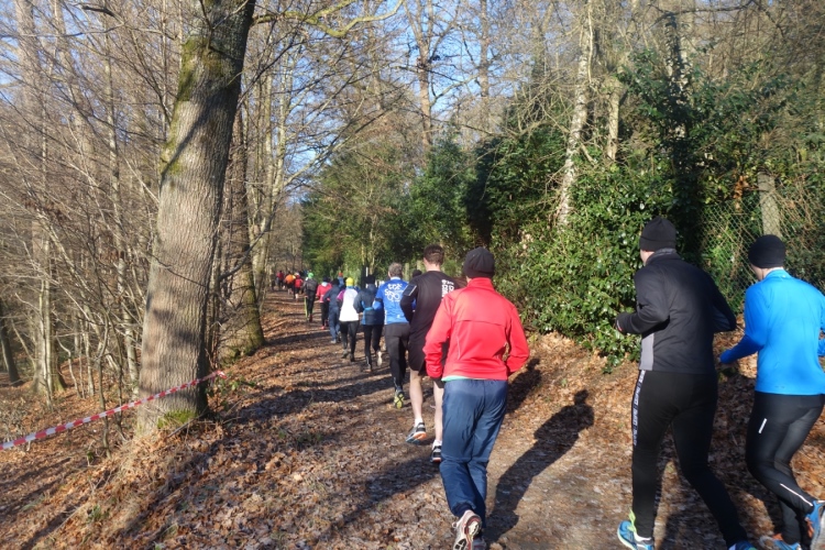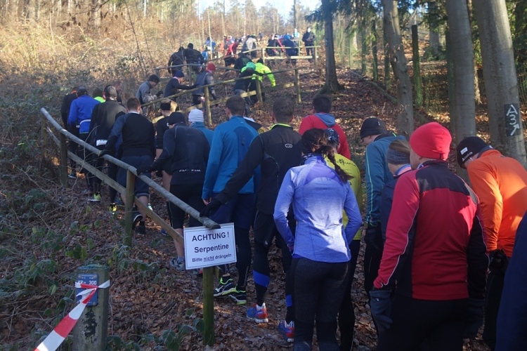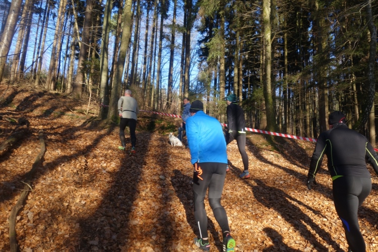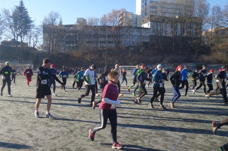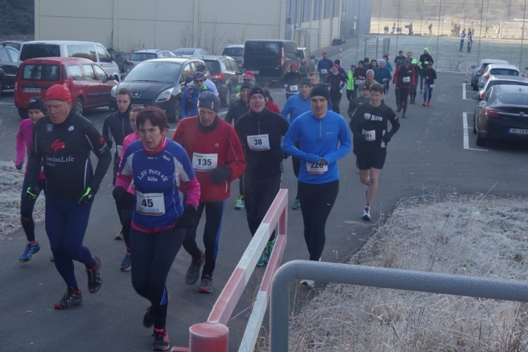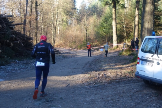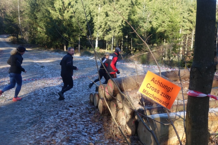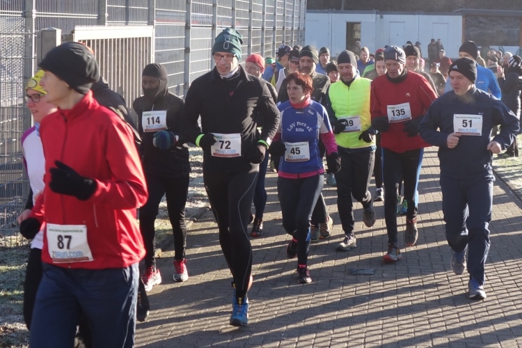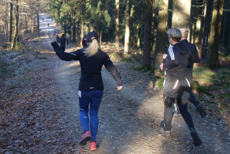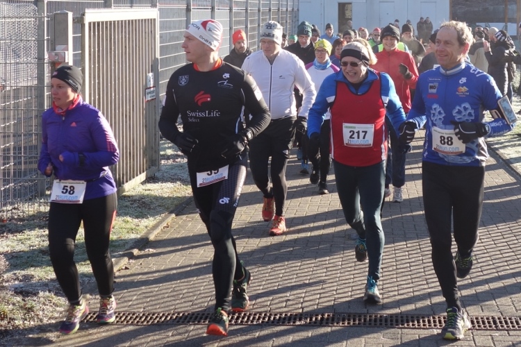Pünktlich um 11.10 Uhr wird dem Tagesdatum gemäß eine Silvesterrakete als Startschuss abgefeuert. Über 200 Läufer setzen sich in Bewegung. Es geht die ersten Meter noch über den Parkplatz am Stadion über Asphalt. Aber nach wenigen hundert Metern ist Schluss mit Asphalt und wir sind im Wald.