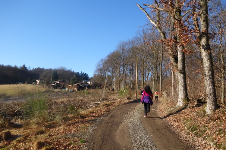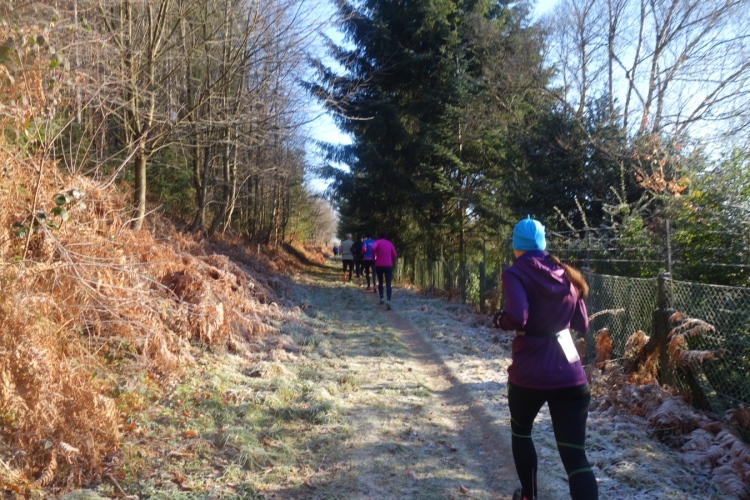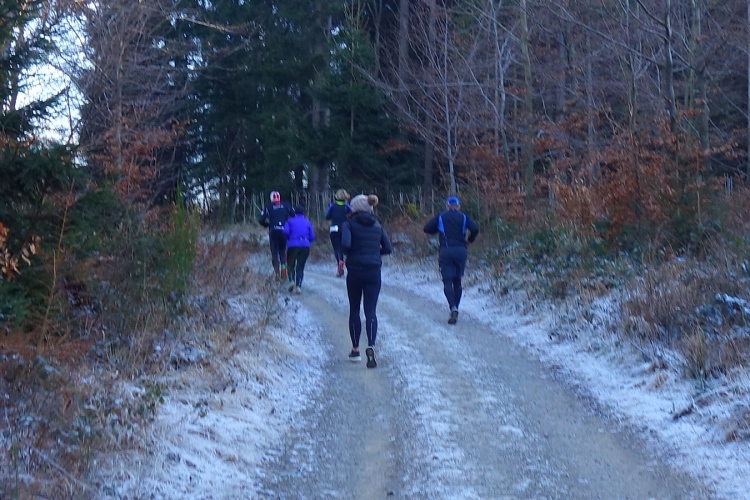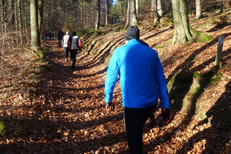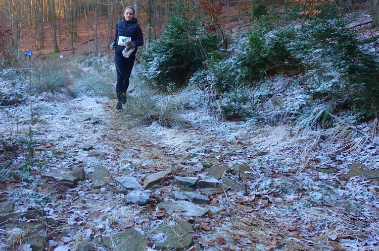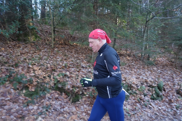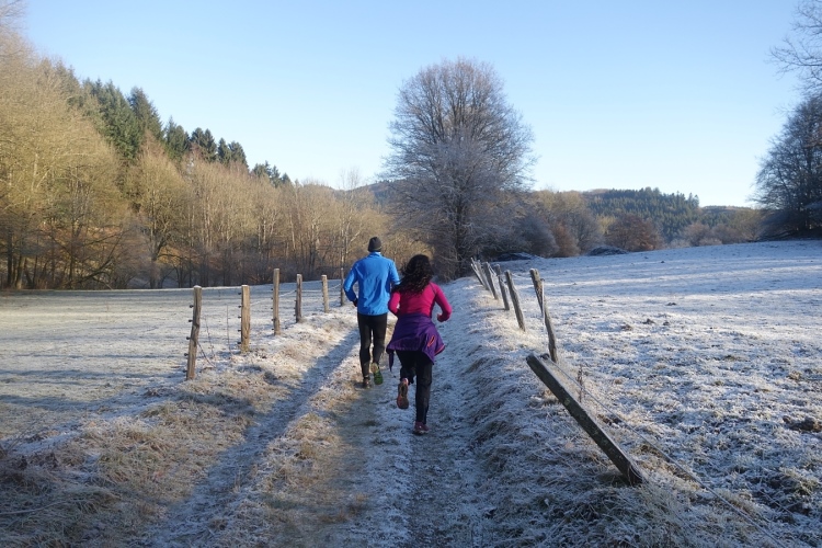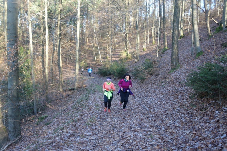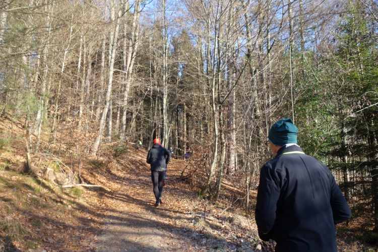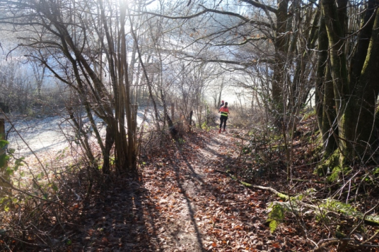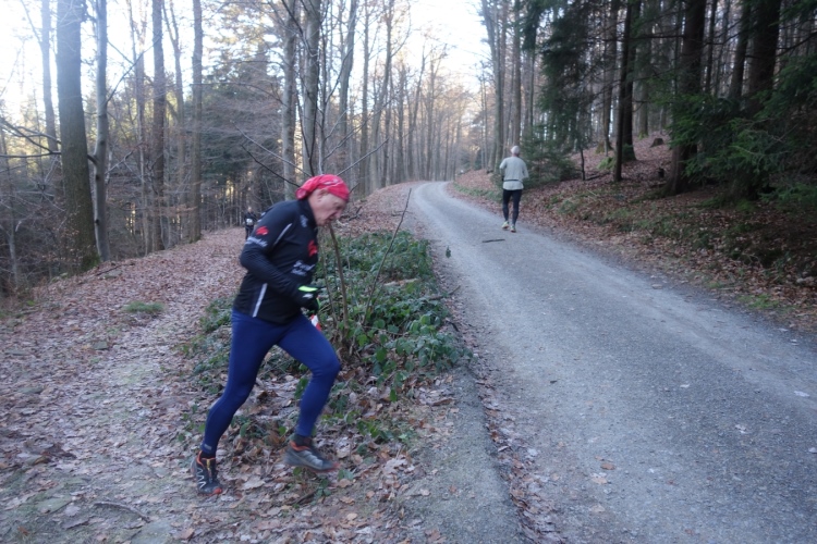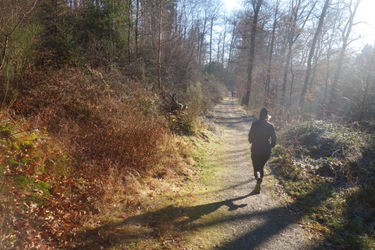 denke ich. Meine Laune steigert sich als wir links in den Wald abbiegen und einen schönen schmalen etwas eingeschnittenen Waldweg hochlaufen. Einfach Klasse. Die Hände sind schon warm geworden, die Kälte ist nicht mehr spürbar.