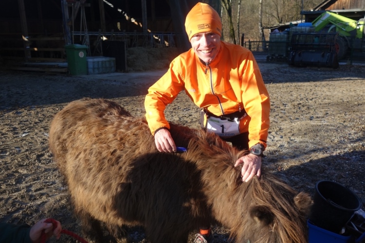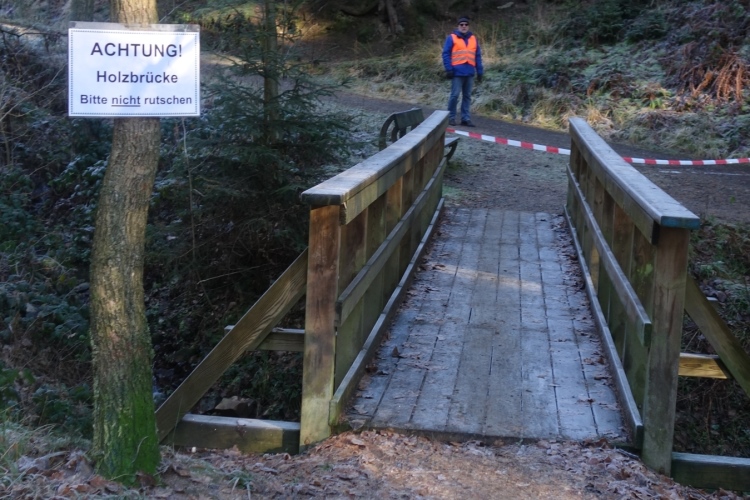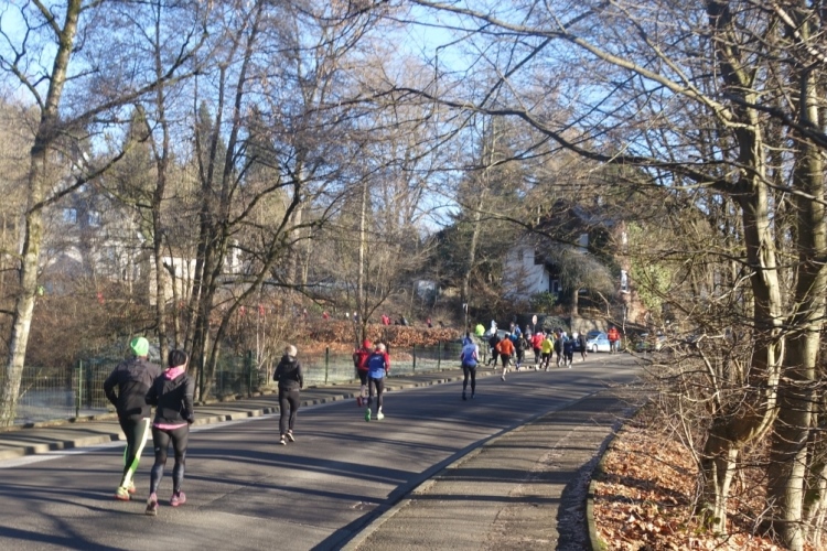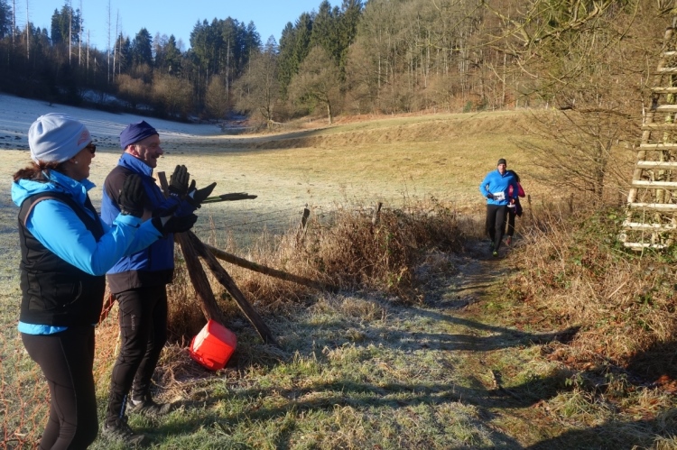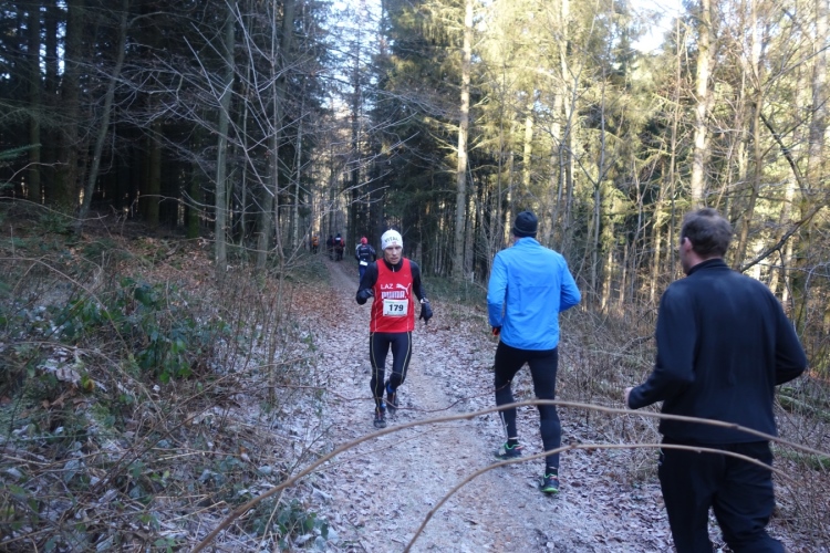 Und es geht direkt aufwärts. Links unter uns ist ein kleiner schon etwas angefrorener Weiher in dem sich Enten in der noch kalten Sonne tummeln. Rechts an der Strecke sehe ich Helmut Urbach. Der ist aber auch bei jeder Laufveranstaltung im Oberbergischen dabei denke ich.