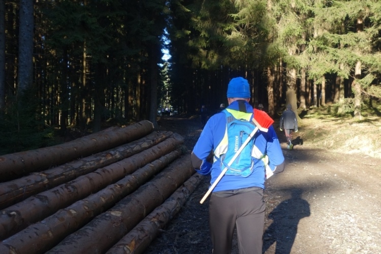 Unser Hohlweg mündet in einen breiten Forstweg. Und da ist er vor mir. Ein Mann mit einem Besen im Rucksack läuft vor mir. Ich frage, ob er hier auf den letzten Zehner warte. Nein sagt er, er laufe hinter dem letzten Fünfer. Der breite Waldweg führt uns über den bewaldeten Sandberg.