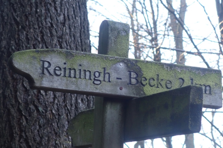 Eine scharfe Kurve führt uns nach rechts. Ein freundlicher Streckenposten warnt jeden Läufer vor der scharfen Kurve. Wir laufen in Richtung Reininghausen-Becke. Nur 2 Km sind es bis dorthin verrät mir ein Schild.