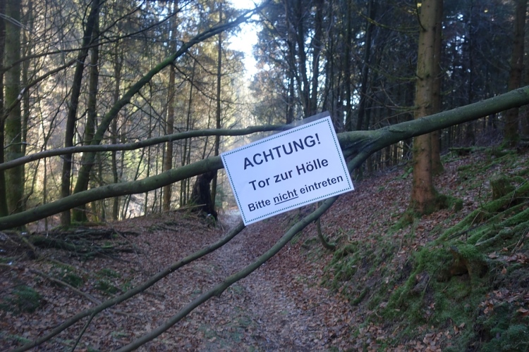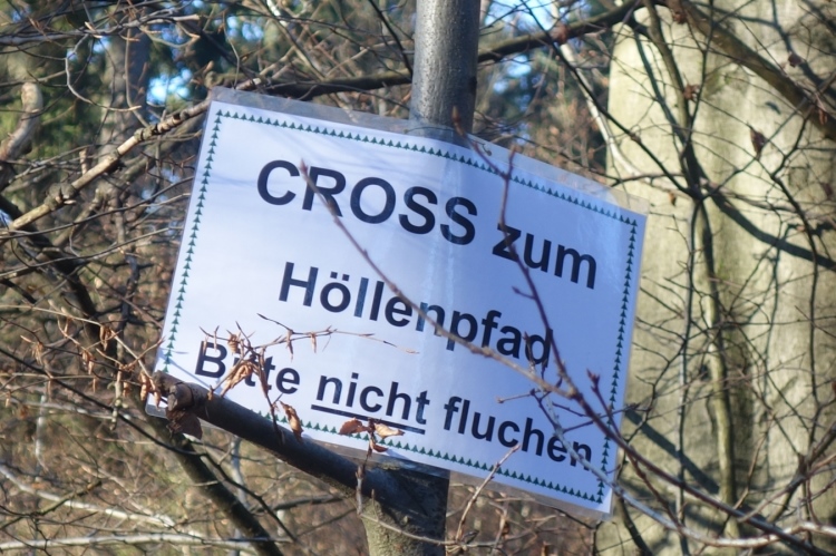 Vorbei am Abzweig hinunter zum Schlammpfad geht es zum Knotenpunkt zurück. Und hier wartet der absolute Höhepunkt der Strecke auf uns. Es gilt den Höllenpfad zu bewältigen. Und dabei wird gebeten von Fluchen abzusehen. Zum Fluchen gibt es aber keinen Grund. Ich genieße wieder jeden Meter der schönen Bergabpassage durch den alten Hohlweg. Es ist zwar auch hier kaum Matsch, aber der Reif erfordert auch hohe Konzentration.
