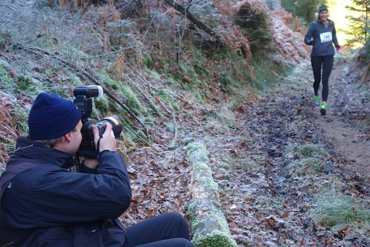 Ein Fotograf hat sich an strategisch günstiger heikler Stelle positioniert und schießt Fotos von den Läufern. Der Höllenpfad ist zwar deutlich länger als die Passage durch den Märchenwald, aber wie der Märchenwald ist auch der Höllenpfad zu kurz.