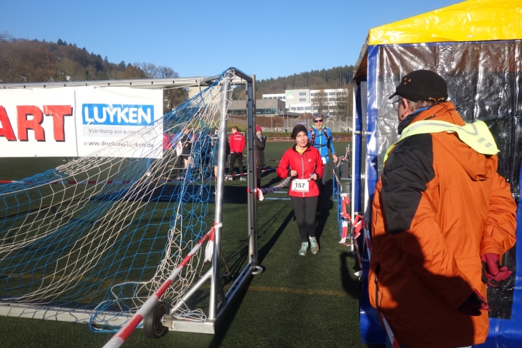 Noch einmal über den Parkplatz und hinein ins Stadion Lochwiese. Ein sehr schöner Lauf ist zu Ende der für meinen Geschmack gerne länger sein dürfte. Im Ziel sehe ich nur fröhliche Gesichter. Ich greife beim angebotenen warmen Tee zu.