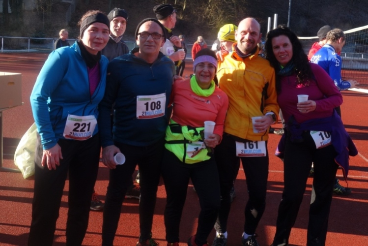 Ich freue mich auf einen schönen Lauf durch das Oberbergische. Es hat am Morgen satte 8 Grad minus, aber es ist sonnig und trocken und verspricht ein schöner Tag zu werden. Da der Start des Hauptlaufes erst um 11.10 Uhr erfolgt, kann ich in Ruhe frühstücken und gemächlich nach Gummersbach fahren. Am Stadion Lochwiese gibt es reichlich Parkplätze und ich schlendere hinüber zur Eugen-Haas-Sporthalle. Hier ist das logistische Zentrum. Es gibt hier die Startunterlagen, Umkleiden und Duschen. Nach dem Lauf finden in der Halle die Siegerehrungen statt.