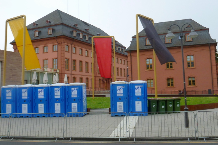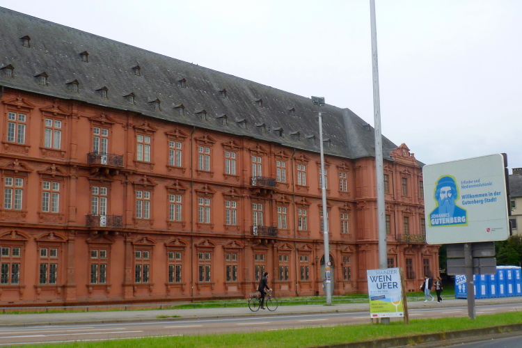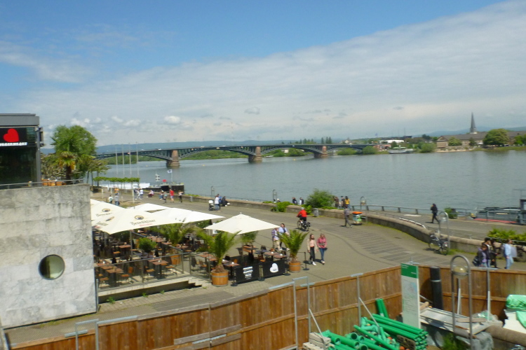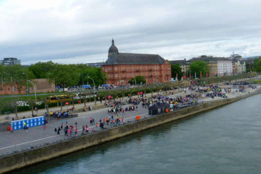 Nach dem Parkrun auf der hessischen Seite marschiere ich auf der Theodor-Heuss-Brücke in die Rheinland-Pfälzische Landeshauptstadt Mainz. Landesgrenze ist die Rheinmitte. So kommt es, dass die rechtsrheinischen Orte Mainz-Kastel und Mainz-Kostheim zur hessischen Landeshauptstadt Wiesbaden gehören, festgelegt von der amerikanische Besatzungsmacht nach dem Zweiten Weltkrieg. Ein Parkrunner erzählt es mir - laufen bildet!