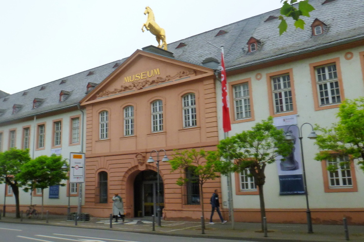 Vorbei an der Rokokokirche St. Peter mit den Zwiebeltürmen sehe ich nach 200 Meter das Landesmuseum Mainz mit der vergoldeten Pferdefigur, der Gebäudekomplex heißt Golden-Ross-Kaserne. Ich habe Mühe, einigermaßen meine Laufrichtung zu halten, die Kamera kann ich nur grob ausrichten, es geht eng im Lauffeld zu. Auf der anderen Seile liegt das Stadthaus Große Bleiche.