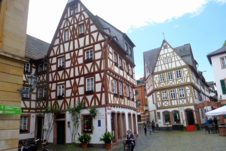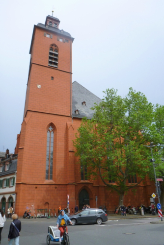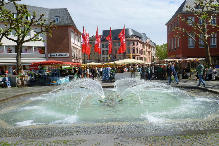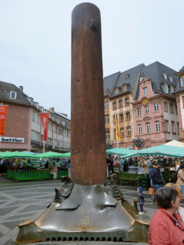 Nun geht es durch einige kleine Gassen, teilweise auf Kopfsteinpflaster, ich sehe den Leichhofbrunnen mit den fünf Figuren aus der Mainzer Geschichte. Im 1980 wurde der auf dem Platz des ehemaligen Domfriedhof errichtet, daher der Name. Zu erkennen ist drauf ein Patrizier, ein römischer Legionär, ein büchertragender Mann, ein kirchlicher Würdenträger und ein Architekt.