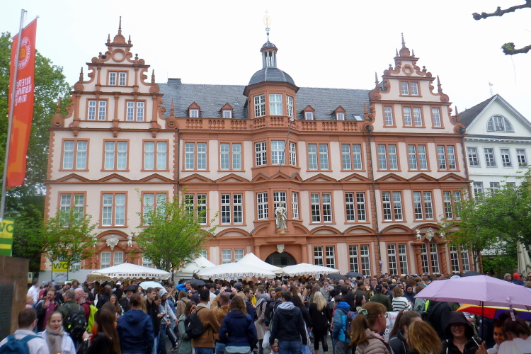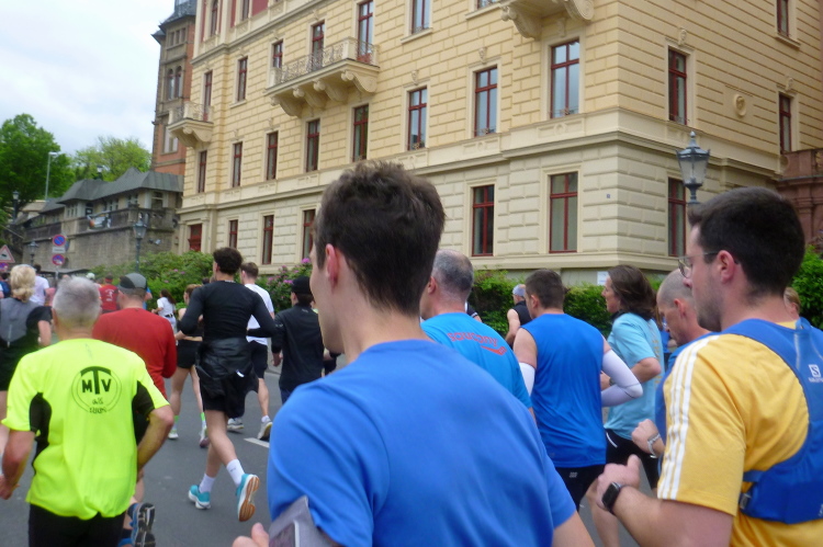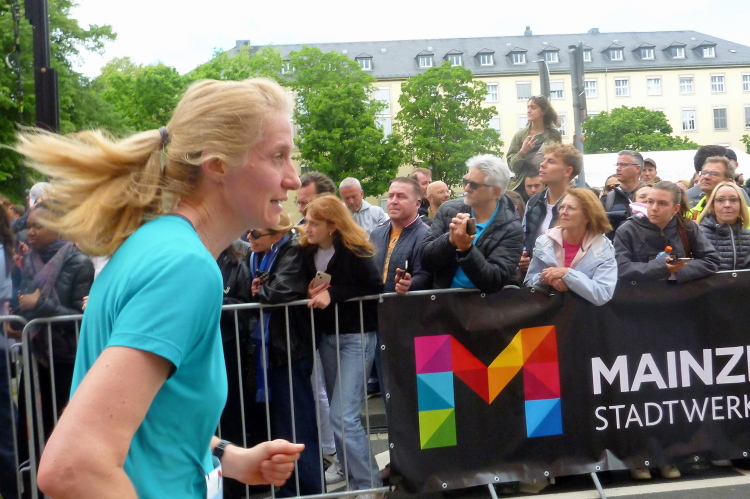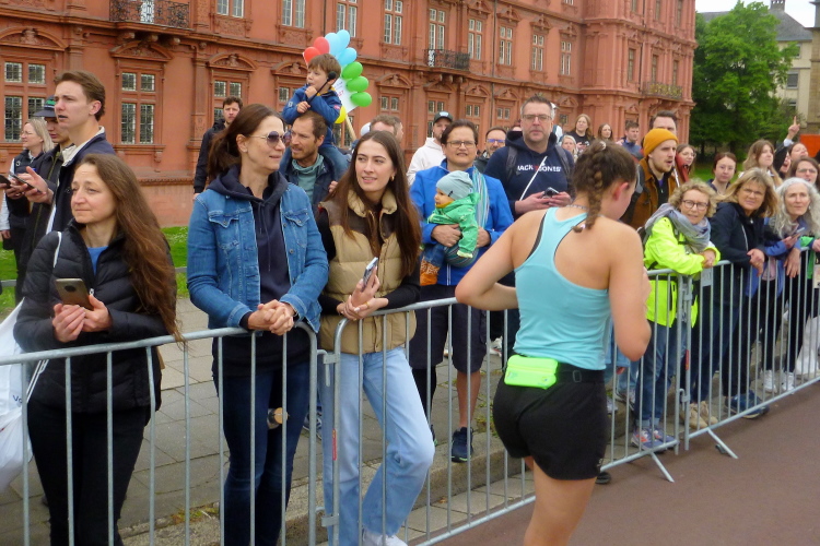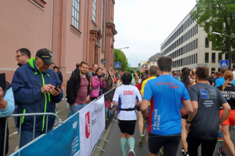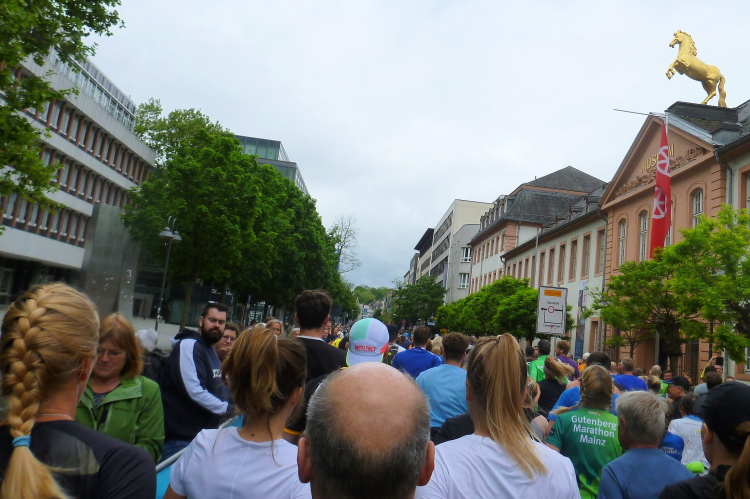 Auf der anderen Seite sehen wir später die Staatskanzlei Rheinland-Pfalz, untergebracht im Neuen Zeughaus. Ministerpräsidentin Malu Dreyer hat dort das Sagen. Wir sind nun wieder in der Nähe des Startgeländes angekommen, viele Zuschauer stehen am Kurs. Wir sehen linkerhand die Rheinseite des Kurfürstlichen Schlosses, die „Gut Stubb“ von Meenz. „Mainz bleibt Mainz, wie es singt und lacht“ wird aus dem Großen Saal des Schlosses übertragen. Das weiß man sogar bei uns in Bayern. Zurück zum Rennen: Die Absperrgitter enden und die Leute stehen auf der Straße, sie gehen erst zurück, als Läuferpulks durch diese Engstellen wollen, fast wie bei der Tour de France in den Bergen.